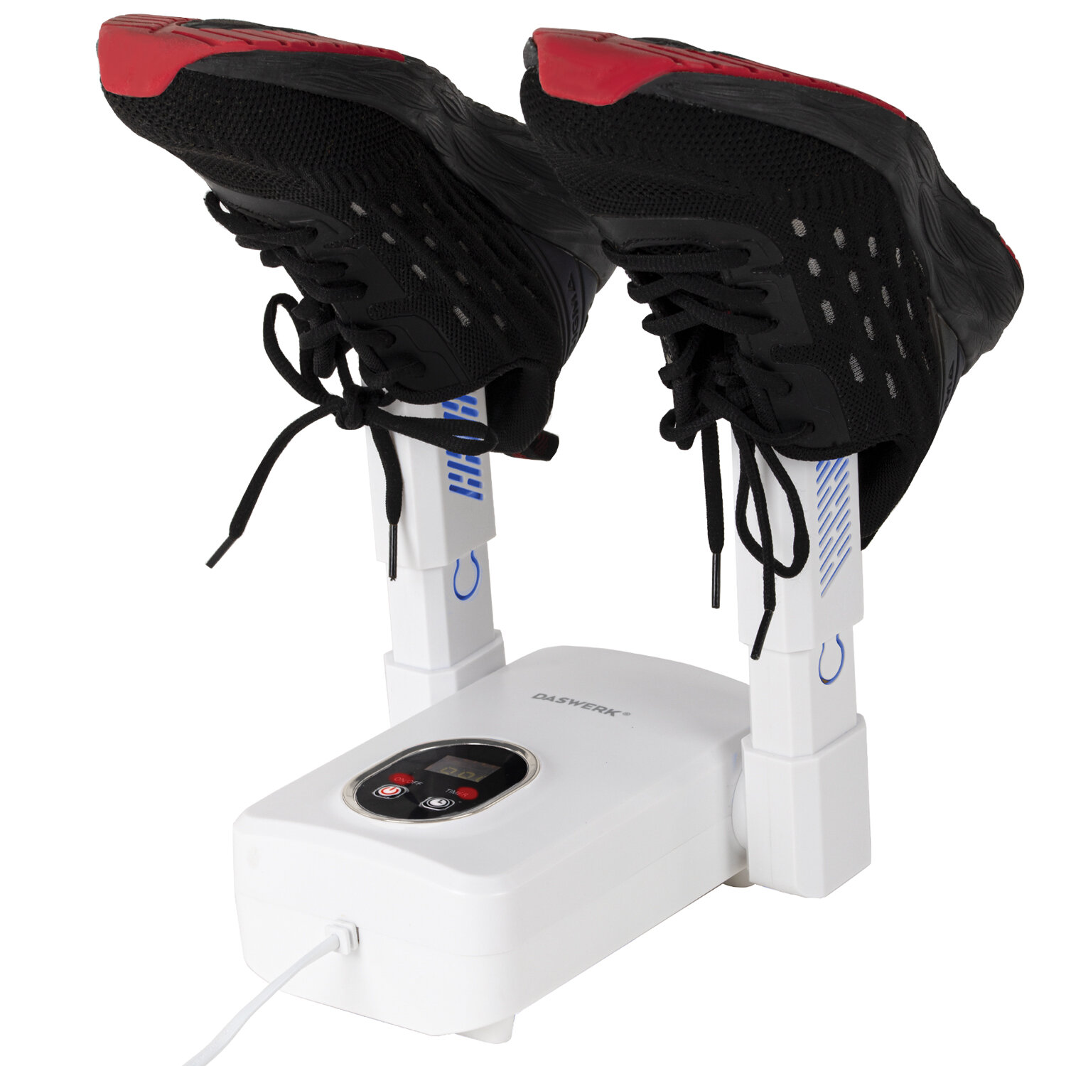 Сушилка для обуви DASWERK с подсветкой изготовлена из огнеупорного пластика, а нагревательный элемент надежно изолирован, что делает сушилку безопасной в использовании. Тепло быстро распределяется внутри обуви благодаря множеству мелких отверстий и мощному обдуву. Оптимальная температура и плавный нагрев позволяет бережно сушить и дезинфицировать обувь, не деформируя ее. Внутри сушилки установлены два контейнера с розовой солью, которая позволяет устранить неприятный запах и микробы.
