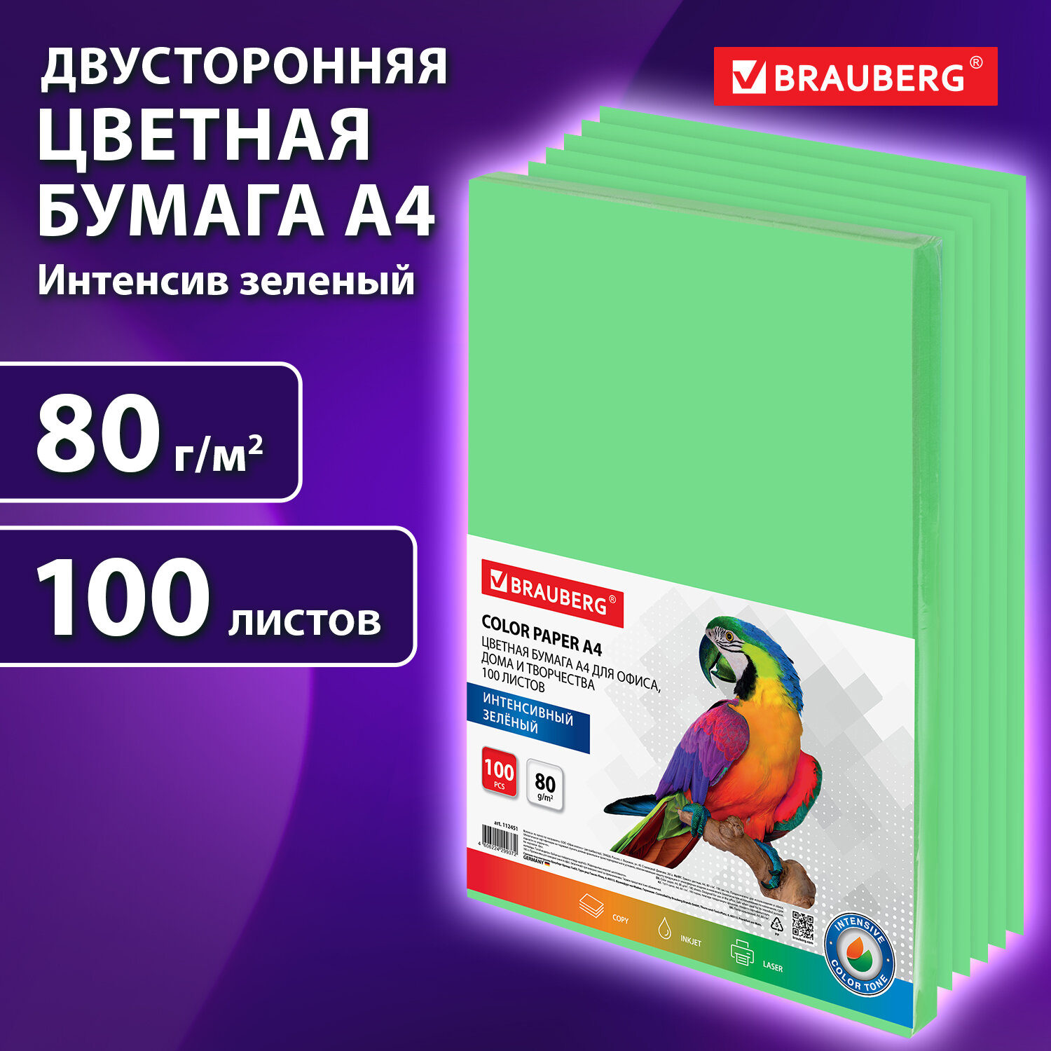 - Бумага цветная BRAUBERG, А4, 80 г/м2, 100 л., интенсив, зеленая, для офисной техники, 112451