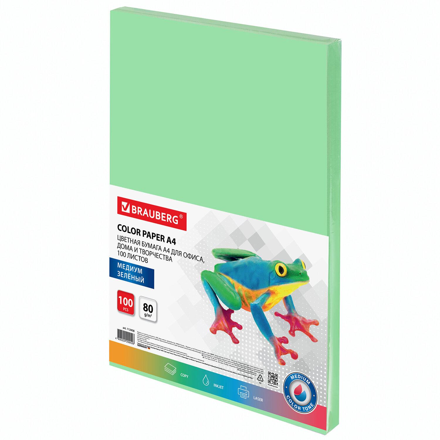 - Бумага цветная BRAUBERG, А4, 80 г/м2, 100 л., медиум, зеленая, для офисной техники, 112458