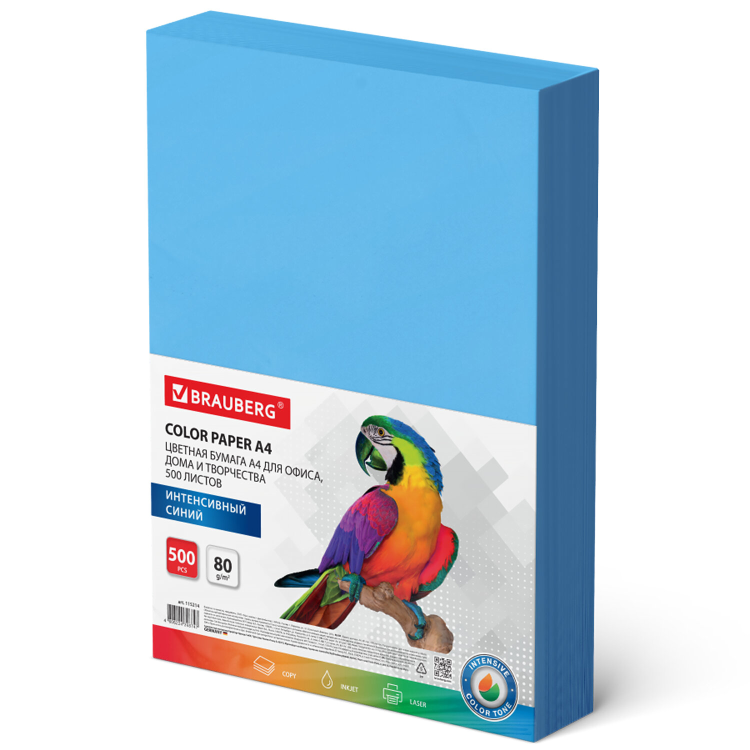 - Бумага цветная BRAUBERG, А4, 80 г/м2, 500 л., интенсив, синяя, для офисной техники, 115214