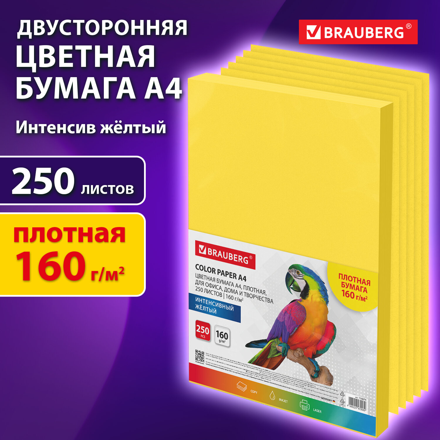 Упакована в пачку из 250 листов формата А4. В упаковке бумага интенсивного тона желтого цвета. Листы бумаги с повышенной плотностью 160 г/м2 подходят для офисной техники.