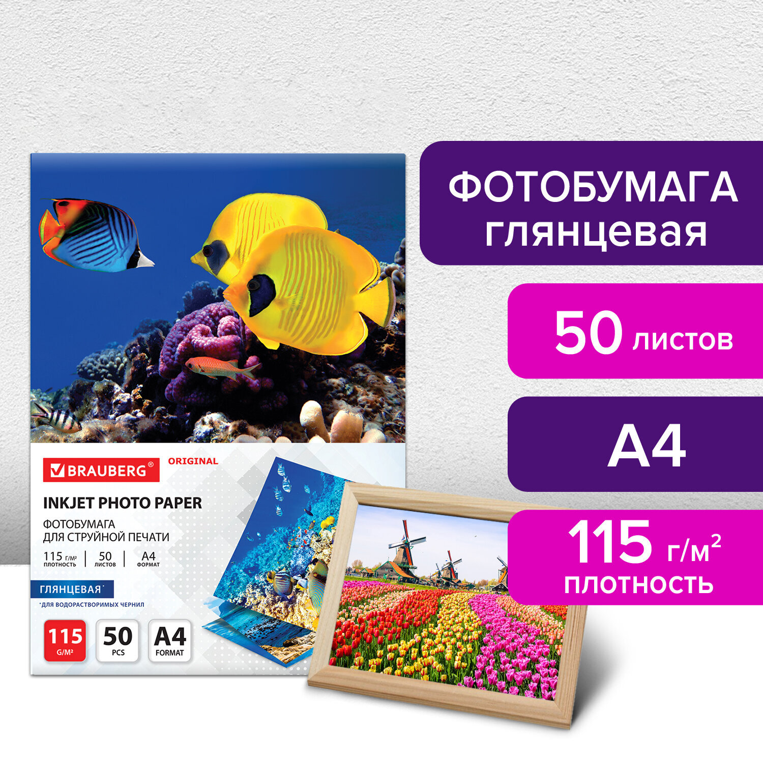 - Фотобумага глянцевая, А4, 115 г/м2, односторонняя, 50 листов, BRAUBERG ORIGINAL, 363980