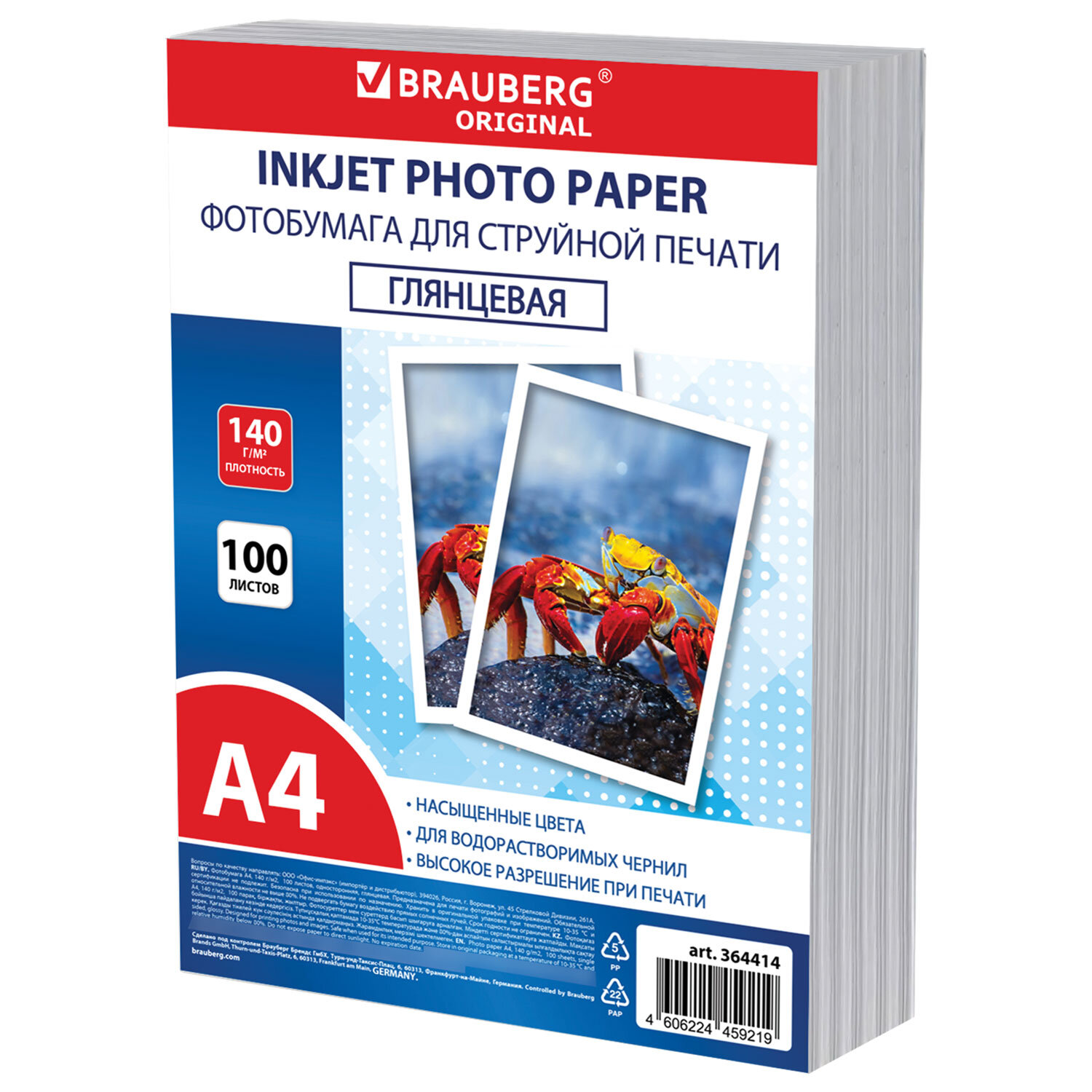 - Фотобумага глянцевая, А4, 140 г/м2, односторонняя, 100 листов, ПАКЕТ, BRAUBERG ORIGINAL, 364414