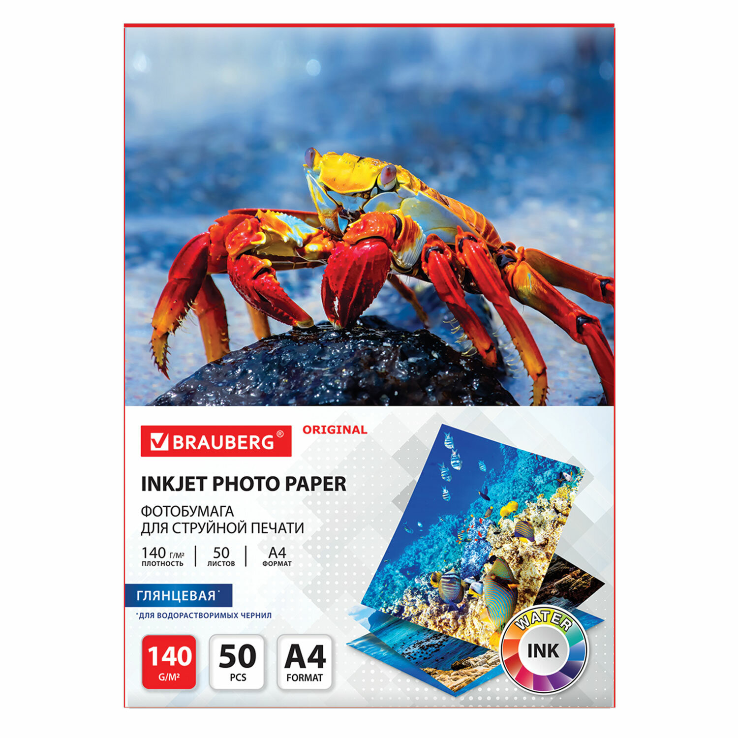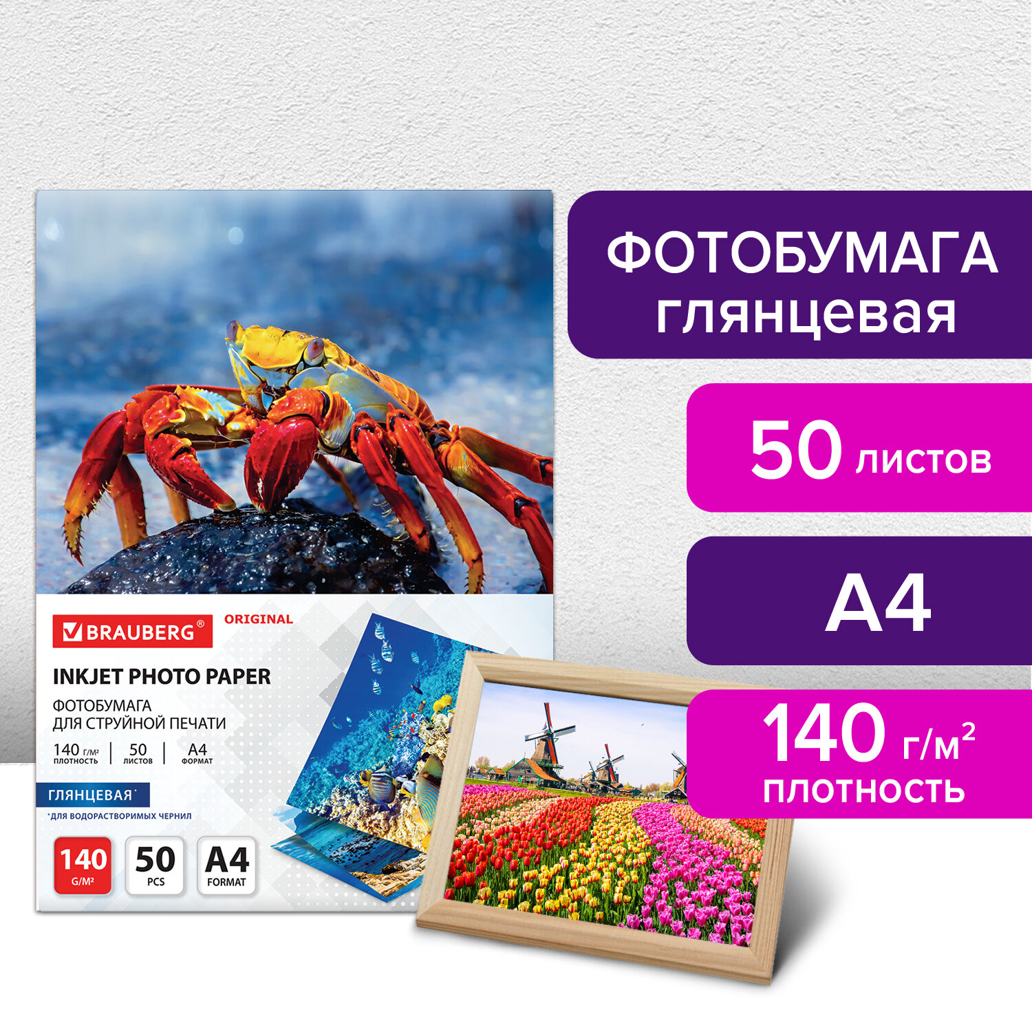 - Фотобумага глянцевая, А4, 140 г/м2, односторонняя, 50 листов, BRAUBERG ORIGINAL, 363982