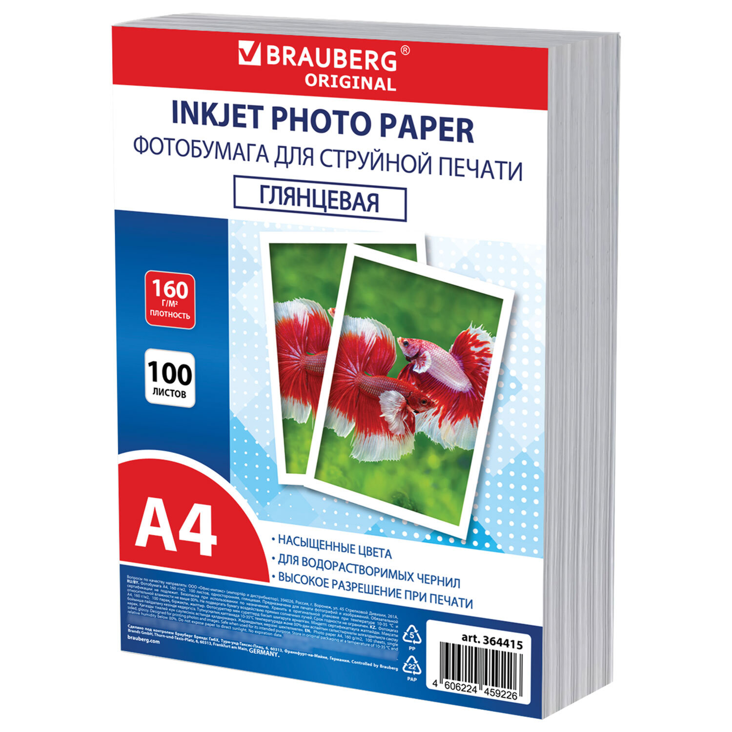 - Фотобумага глянцевая, А4, 160 г/м2, односторонняя, 100 листов, ПАКЕТ, BRAUBERG ORIGINAL, 364415