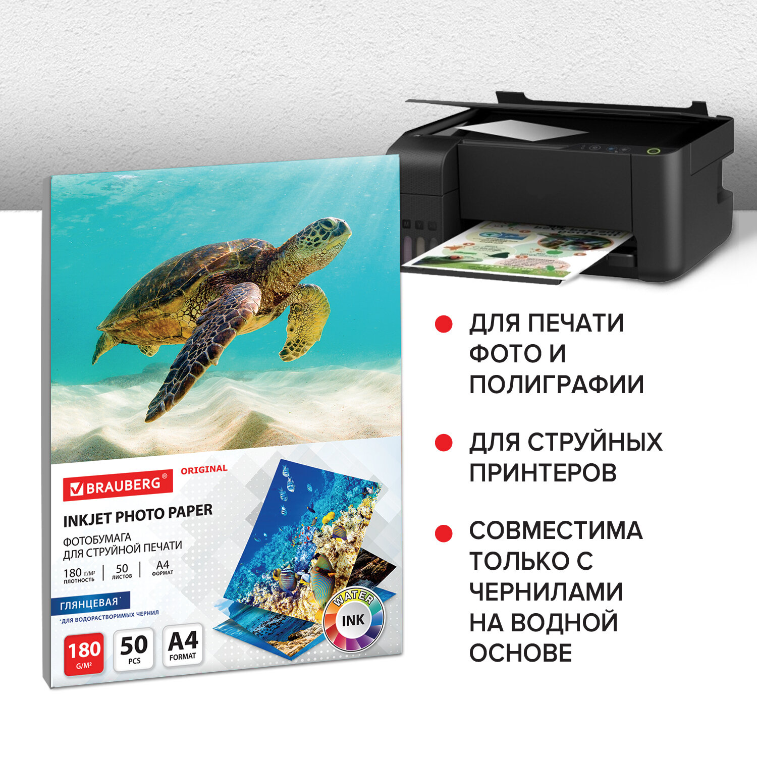 - Фотобумага глянцевая, A4, 180 г/м2, односторонняя, 50 листов, BRAUBERG ORIGINAL, 363986