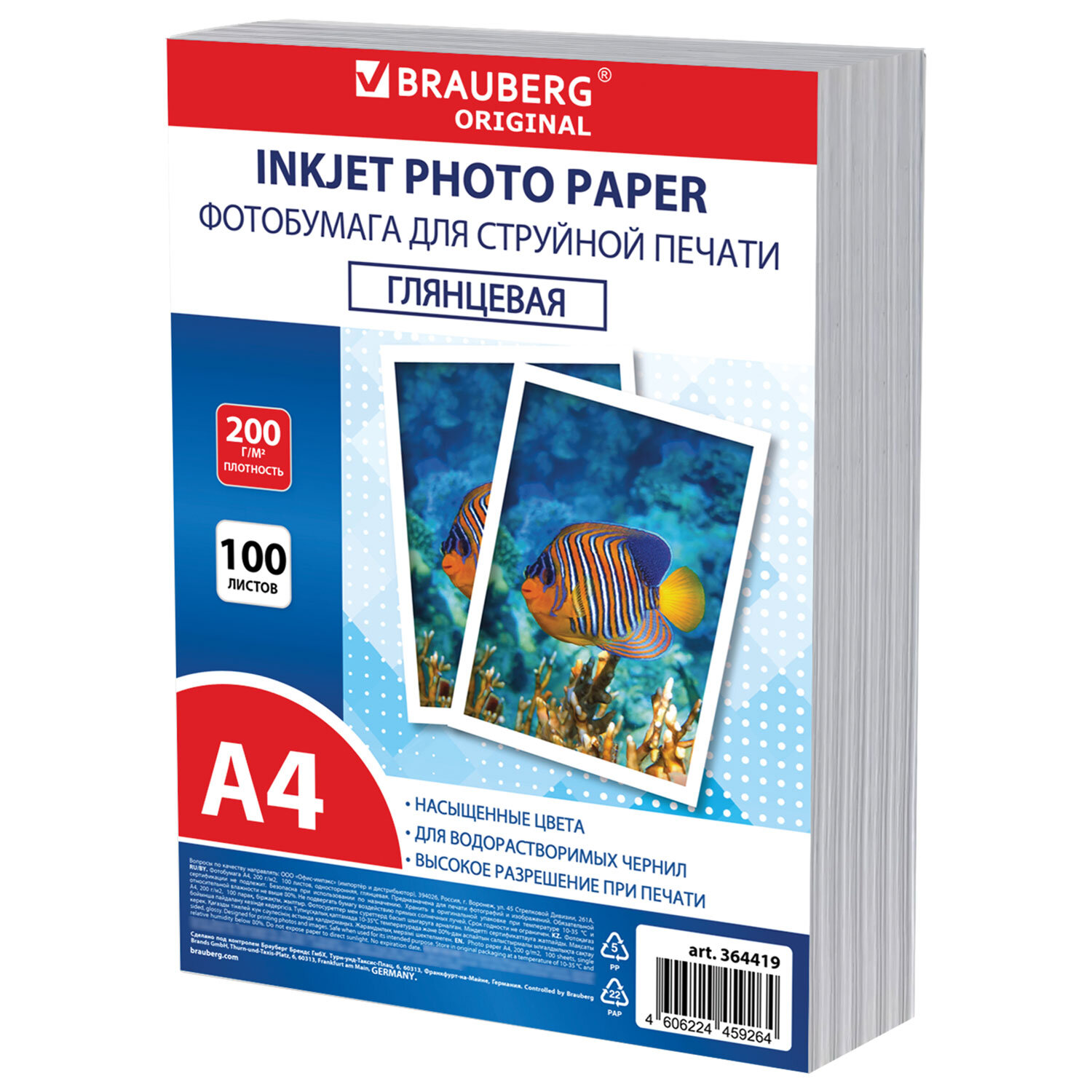 - Фотобумага глянцевая, А4, 200 г/м2, односторонняя, 100 листов, ПАКЕТ, BRAUBERG ORIGINAL, 364419