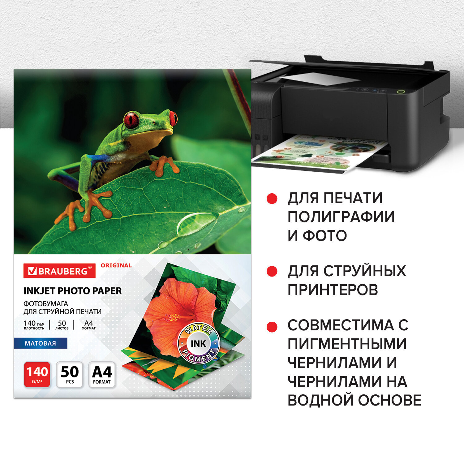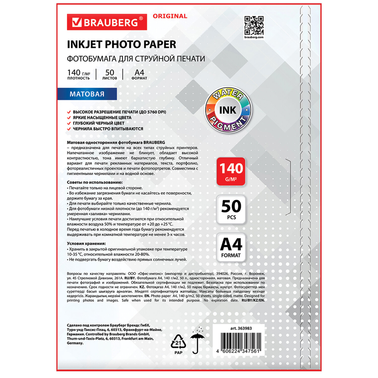 - Фотобумага матовая, А4, 140 г/м2, односторонняя, 50 листов, BRAUBERG ORIGINAL, 363983