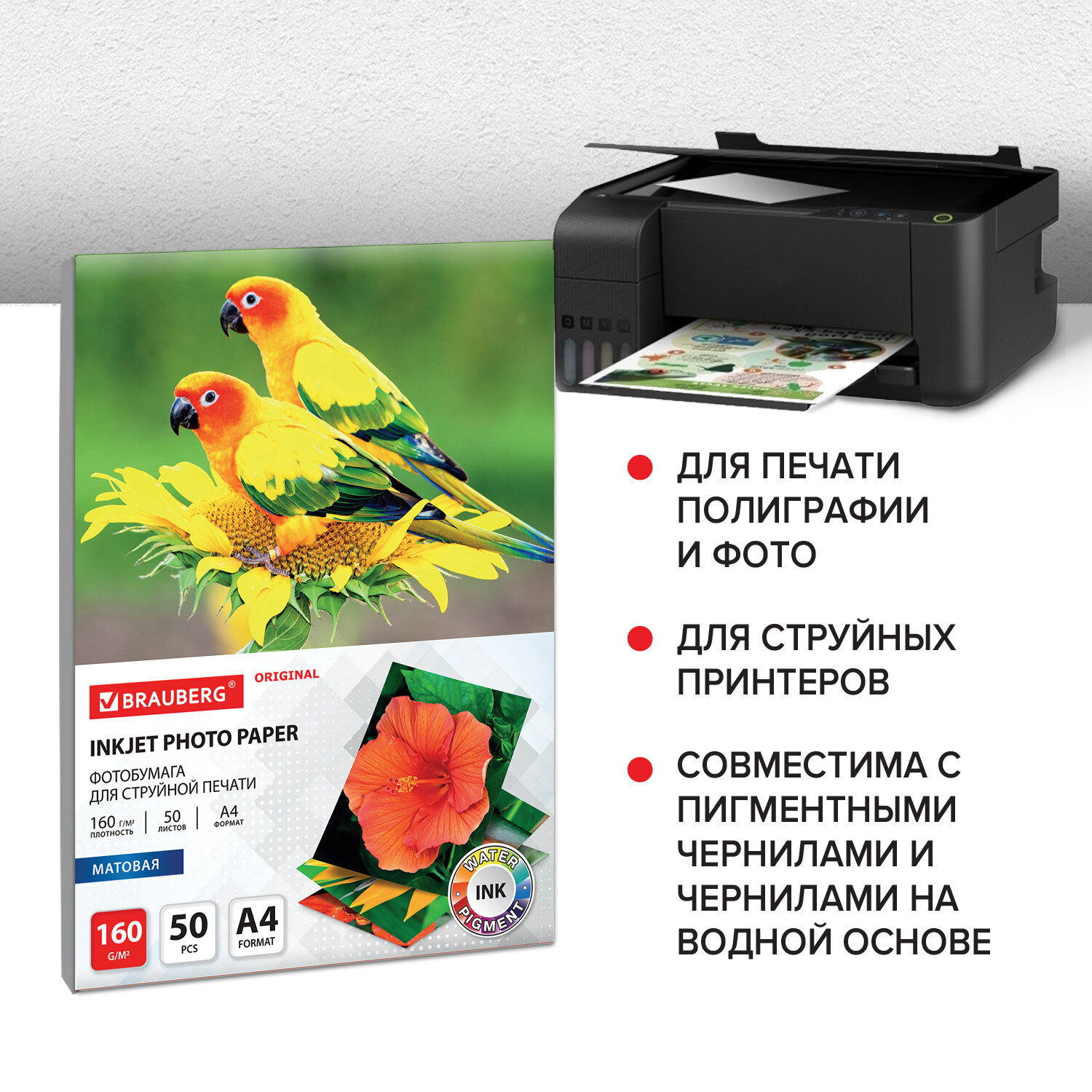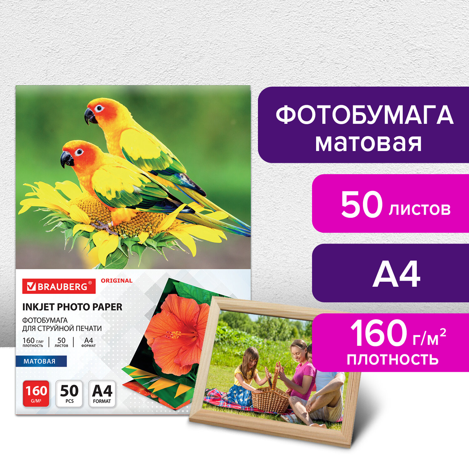 - Фотобумага матовая, А4, 160 г/м2, односторонняя, 50 листов, BRAUBERG ORIGINAL, 363985