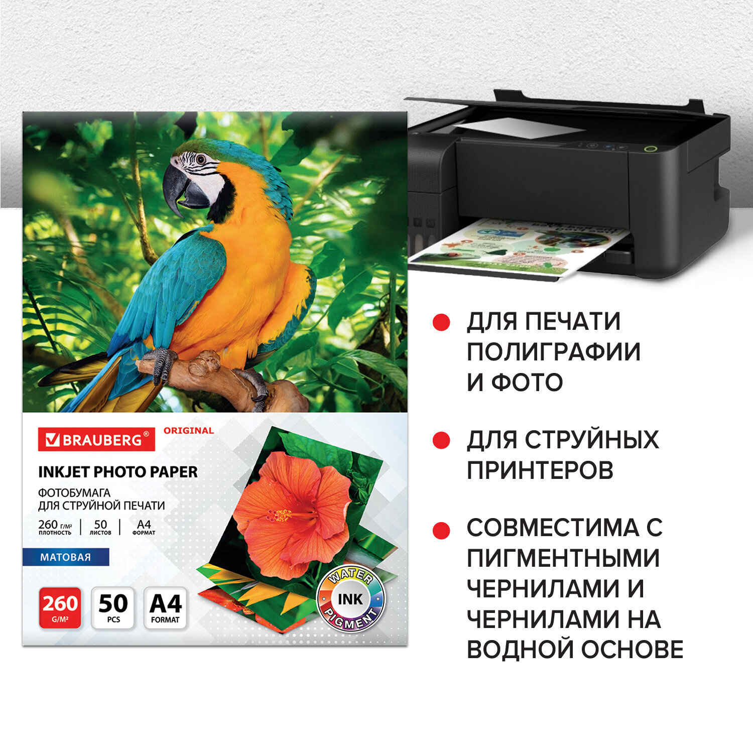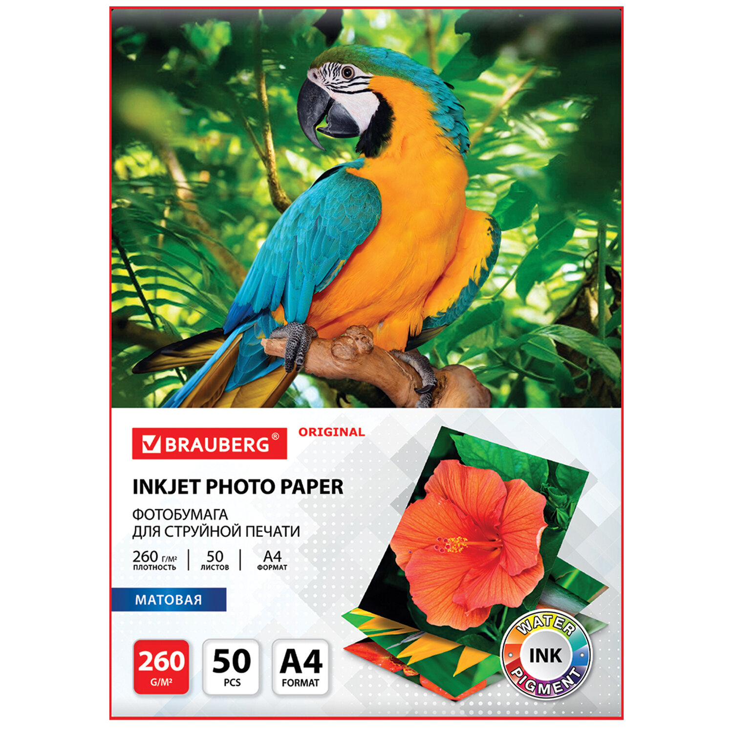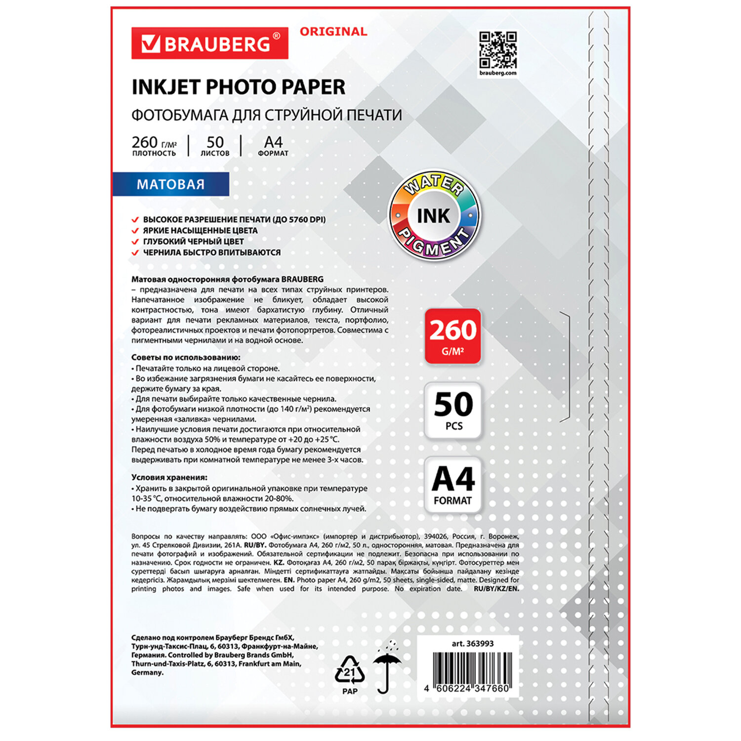 - Фотобумага матовая, А4, 260 г/м2, односторонняя, 50 листов, BRAUBERG ORIGINAL, 363993