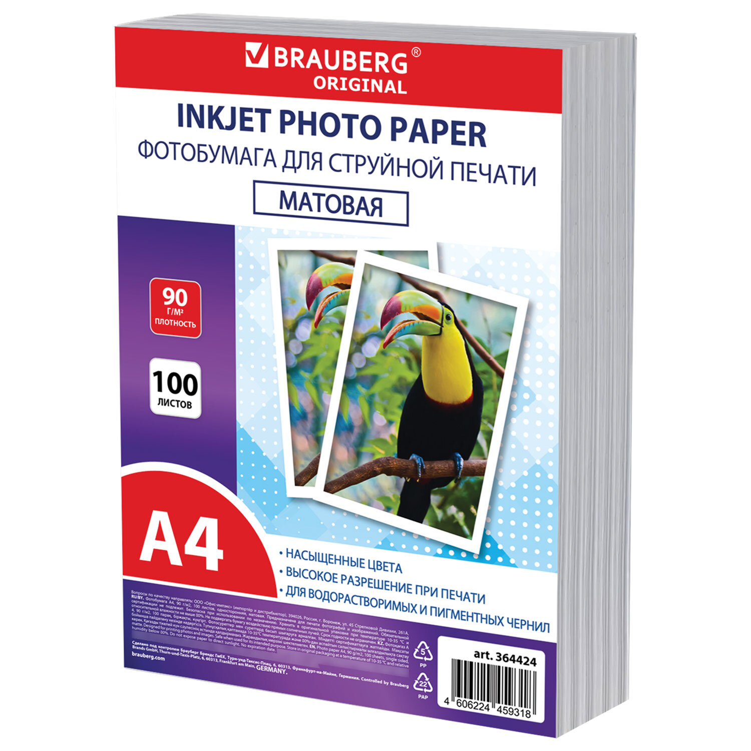 - Фотобумага матовая, А4, 90 г/м2, односторонняя, 100 листов, ПАКЕТ, BRAUBERG ORIGINAL, 364424
