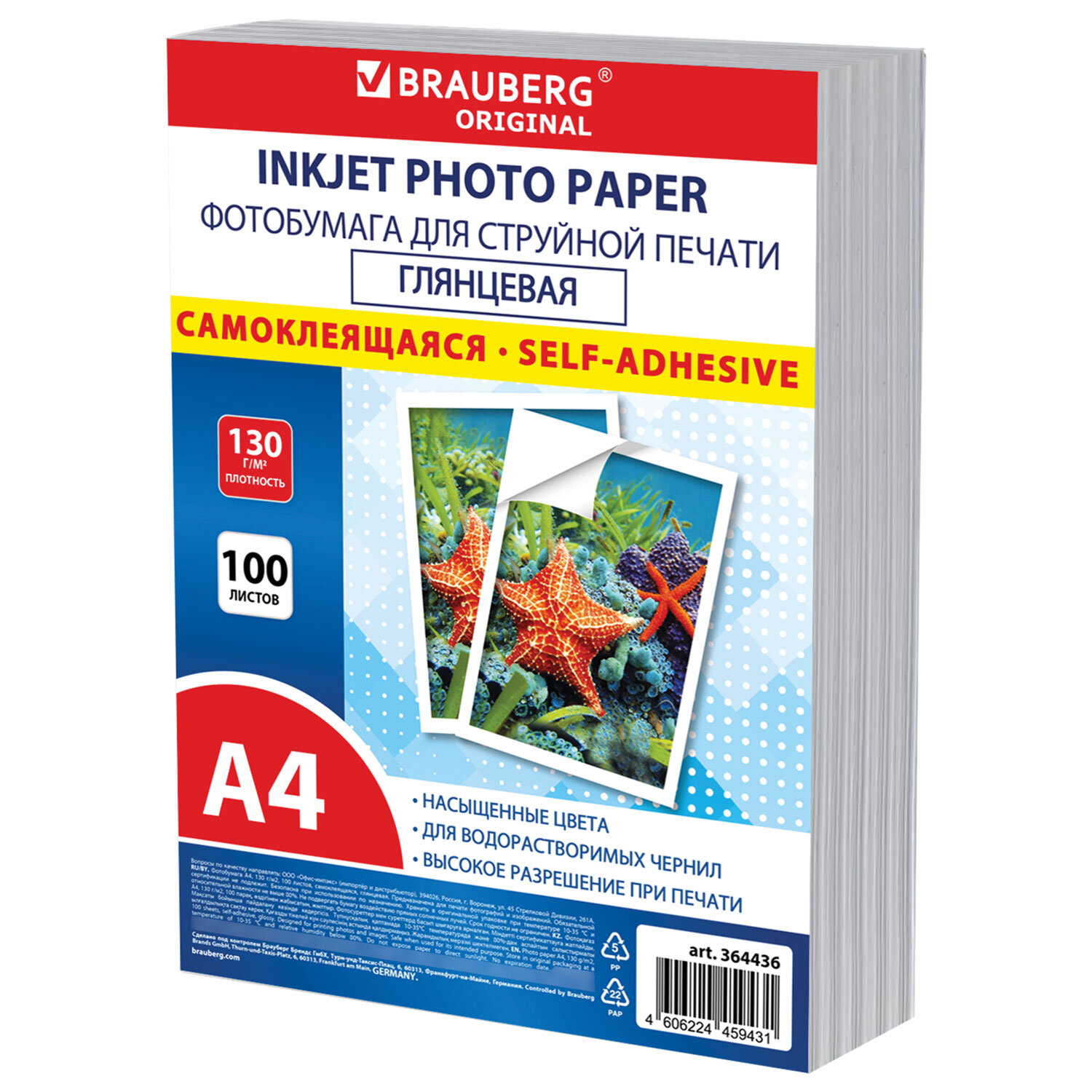 - Фотобумага САМОКЛЕЯЩАЯСЯ глянцевая, А4, 130 г/м2, 100 листов, ПАКЕТ, BRAUBERG ORIGINAL, 364436
