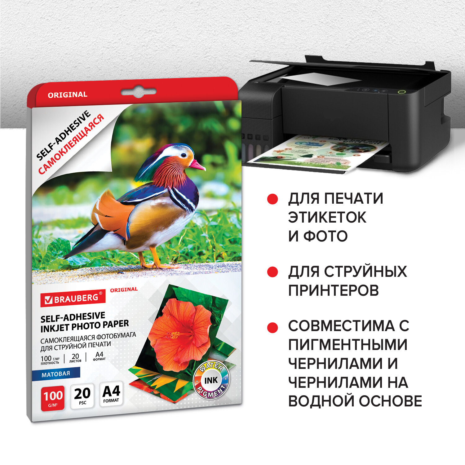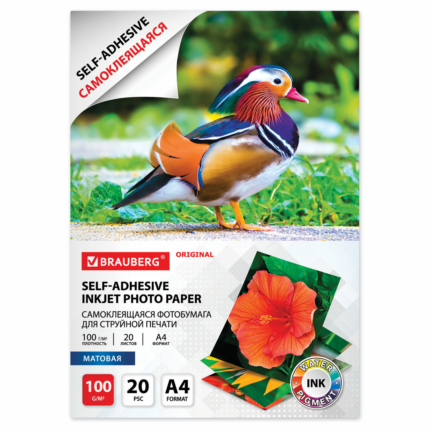 - Фотобумага САМОКЛЕЯЩАЯСЯ матовая, А4, 100 г/м2, 20 листов, BRAUBERG ORIGINAL, 364006