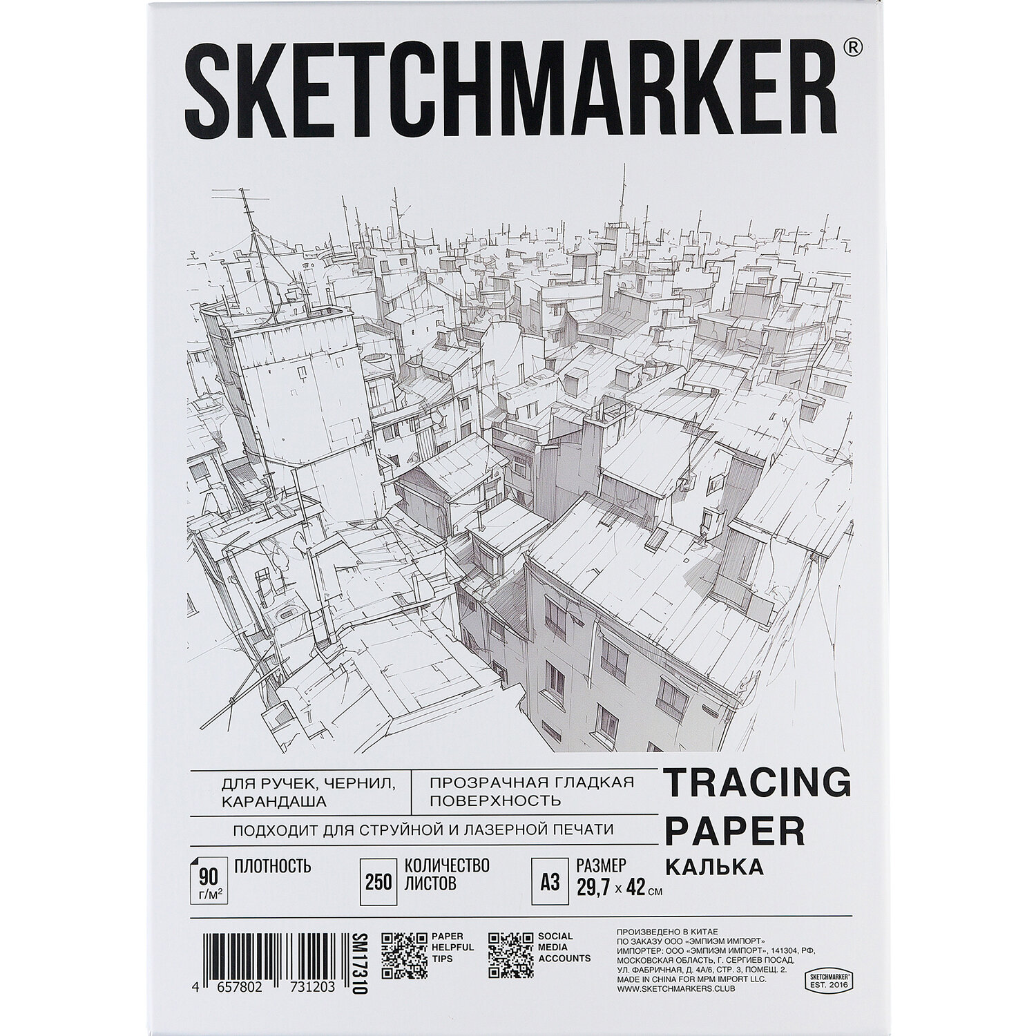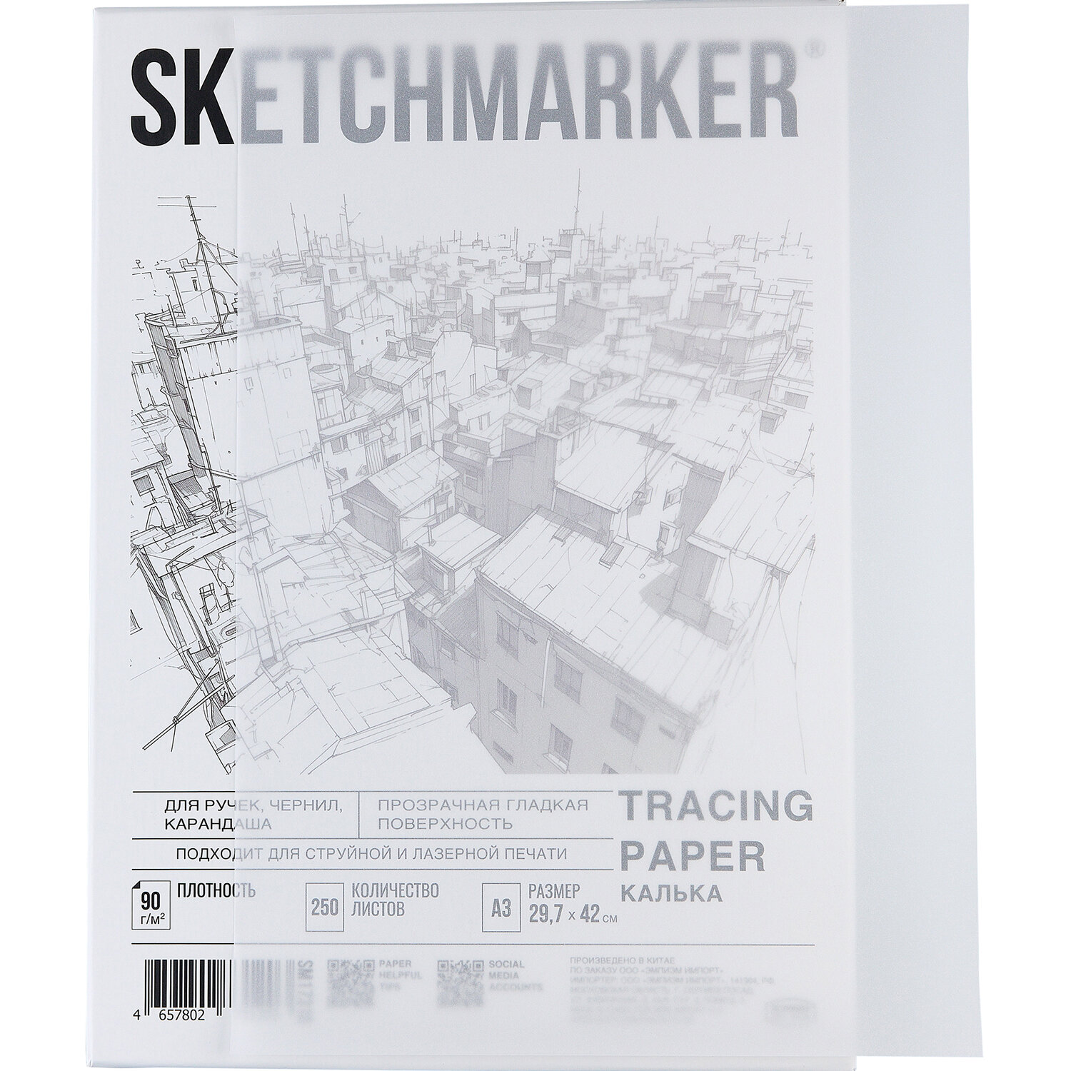 - Калька А3 для печати и творчества, 90 г/м2, 250 листов, SKETCHMARKER, SM17310