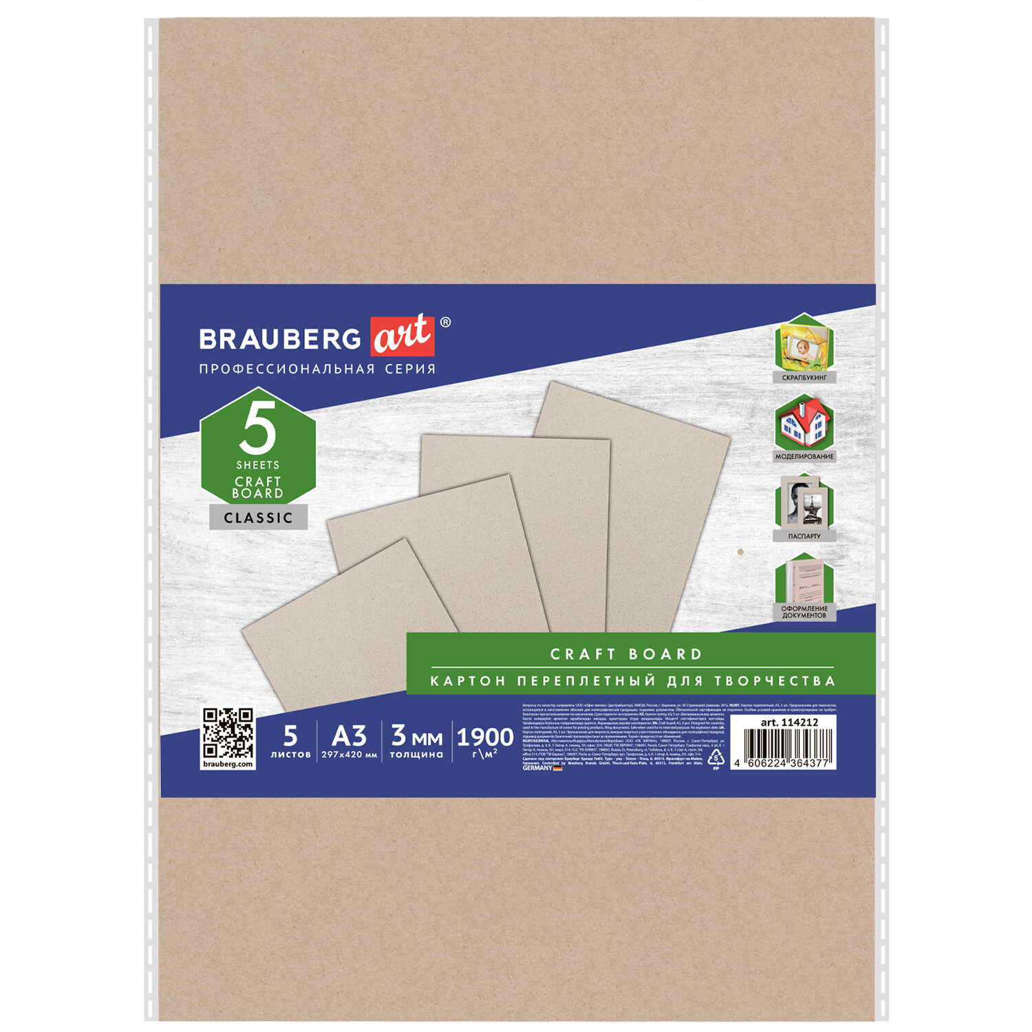 - Картон переплетный, толщина 3 мм, А3 (297х420 мм), КОМПЛЕКТ 5 шт., BRAUBERG ART, 114212