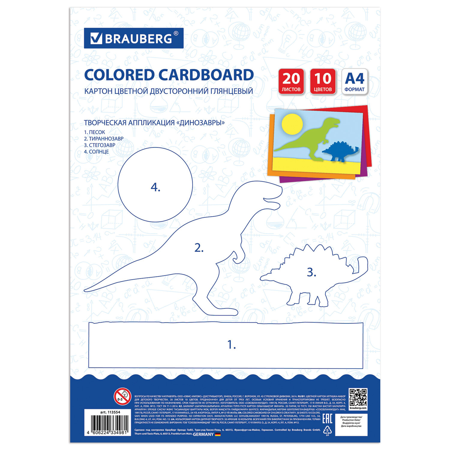 - Картон цветной А4 2-сторонний МЕЛОВАННЫЙ, 20 листов, 10 цветов, в папке, BRAUBERG, 200х290 мм, 113554