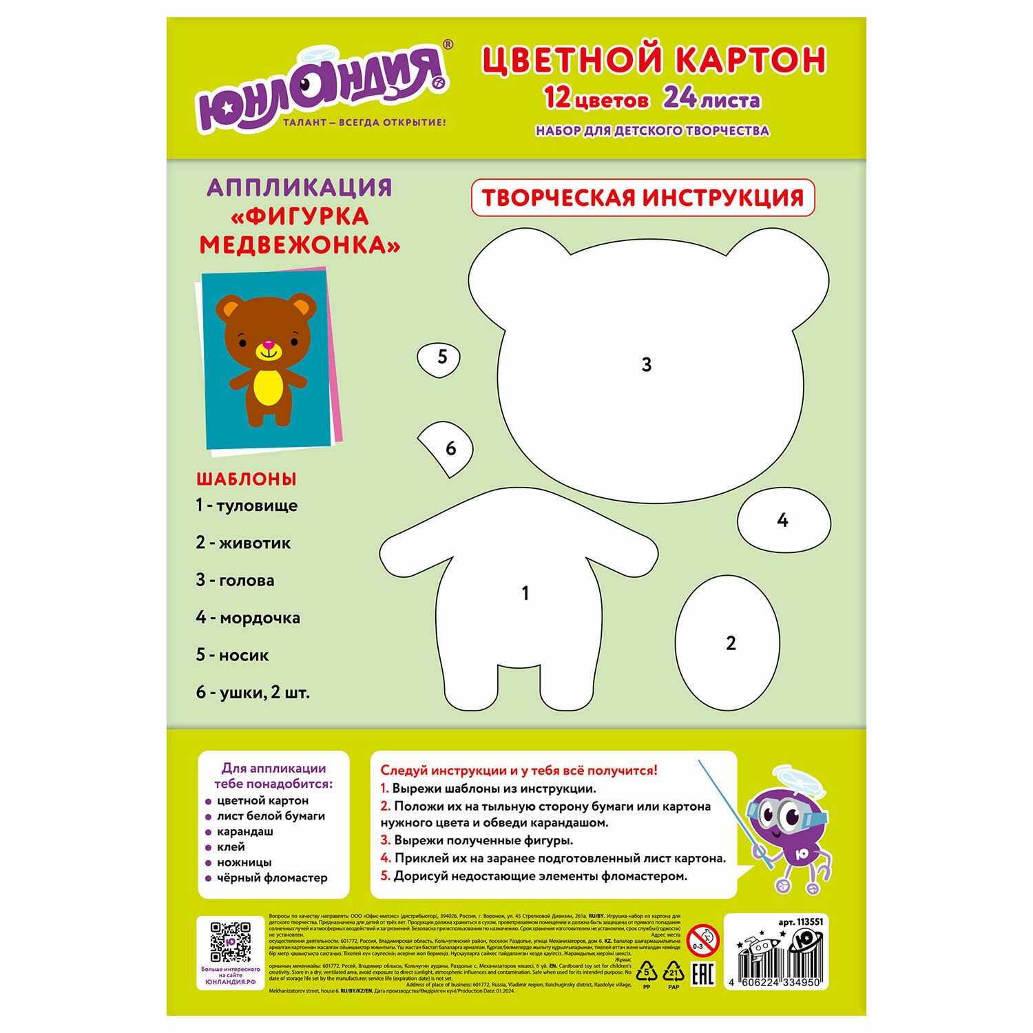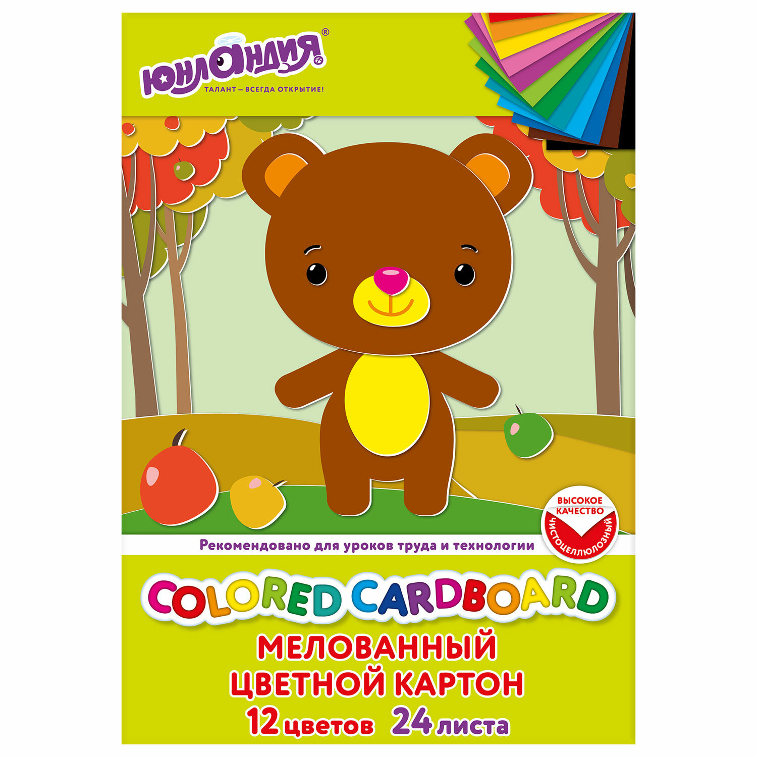 Целлюлозный мелованный картон ЮНЛАНДИЯ с улучшенной прокраской обладает плотностью 200 г/м2, имеет глянцевую поверхность, благодаря чему сохраняет четкость, яркость и насыщенность оттенка на протяжении длительного времени. Картон легко режется ножницами, сгибается и клеится. Внутренний блок состоит из 24 листов формата А4 и 12 цветов. Картон вложен в красочную картонную папку, которая имеет дополнительный нижний клапан, благодаря чему листы не выпадут и не помнутся. Картон цветной А4 МЕЛОВАННЫЙ, 24 листа, 12 цветов, в папке, ЮНЛАНДИЯ, 200х290 мм, 113551
