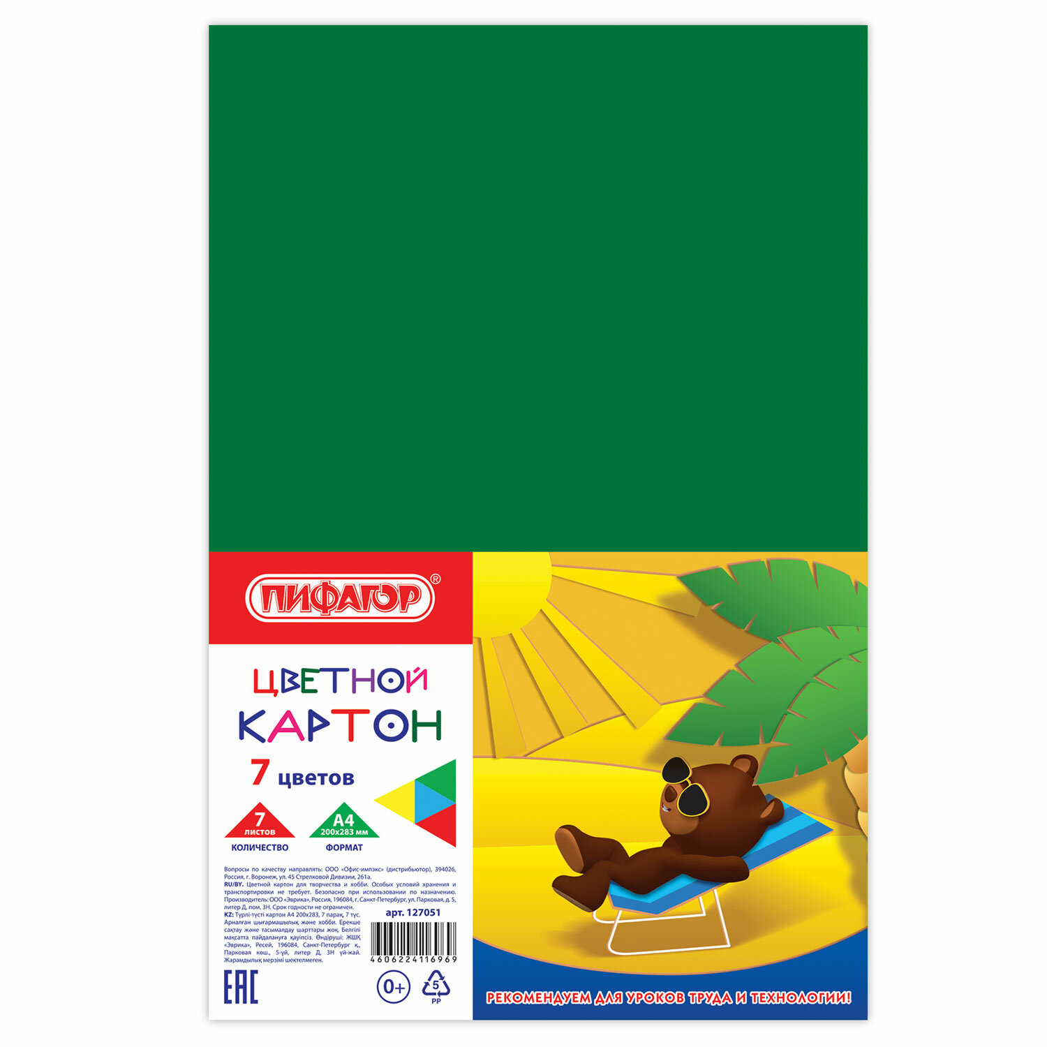 - Картон цветной А4 немелованный (матовый), 7 листов 7 цветов, ПИФАГОР, 200х283 мм, 127051