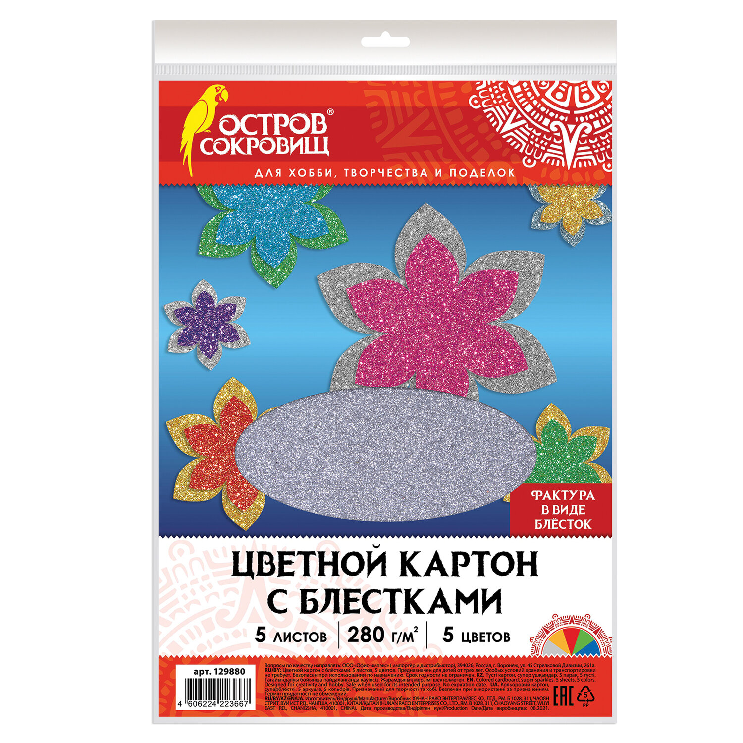 - Картон цветной А4 СУПЕРБЛЕСТКИ, 5 листов 5 цветов, 280 г/м2, ОСТРОВ СОКРОВИЩ, 129880