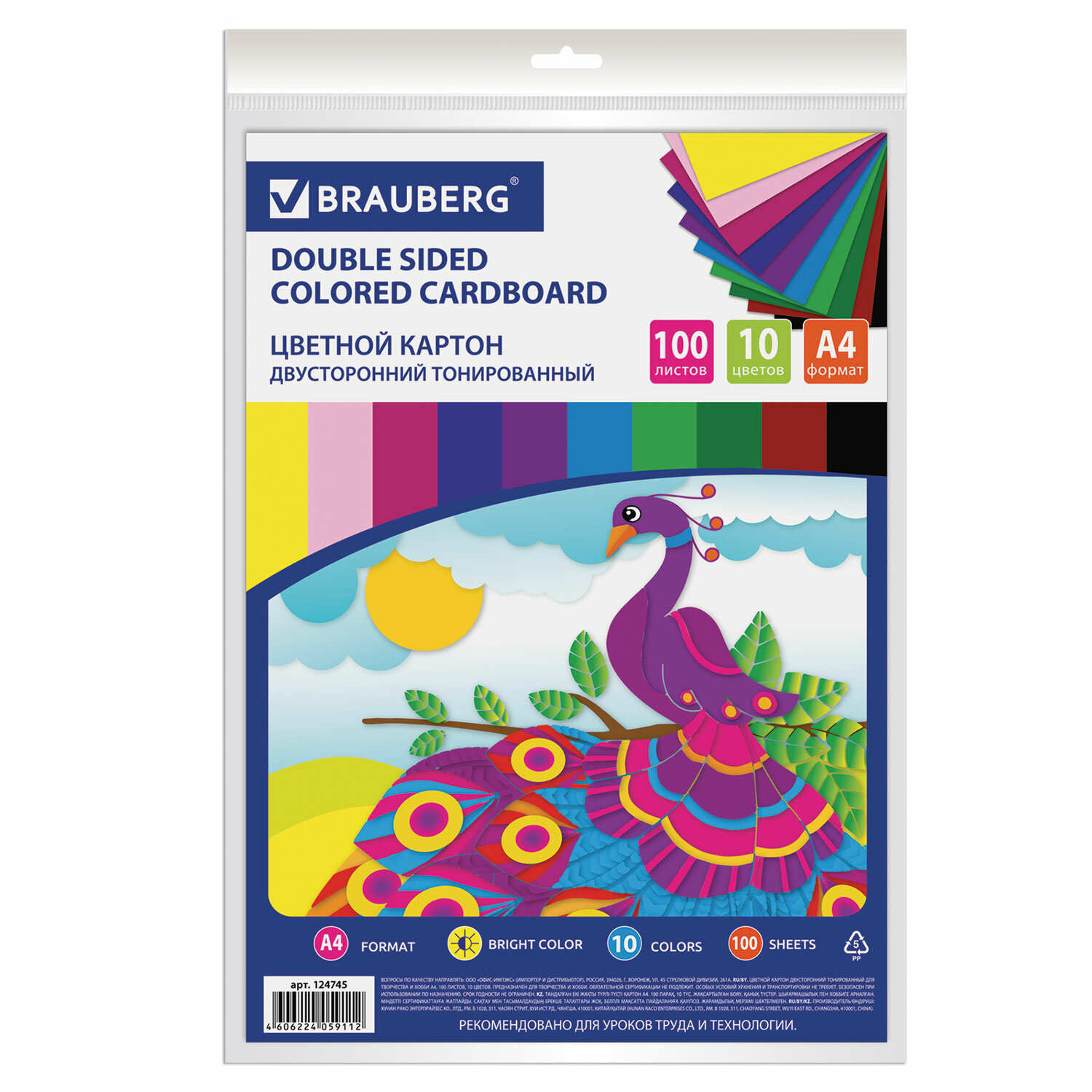 - Картон цветной А4 ТОНИРОВАННЫЙ В МАССЕ, 100 листов 10 цветов, 220 г/м2, BRAUBERG, 124745