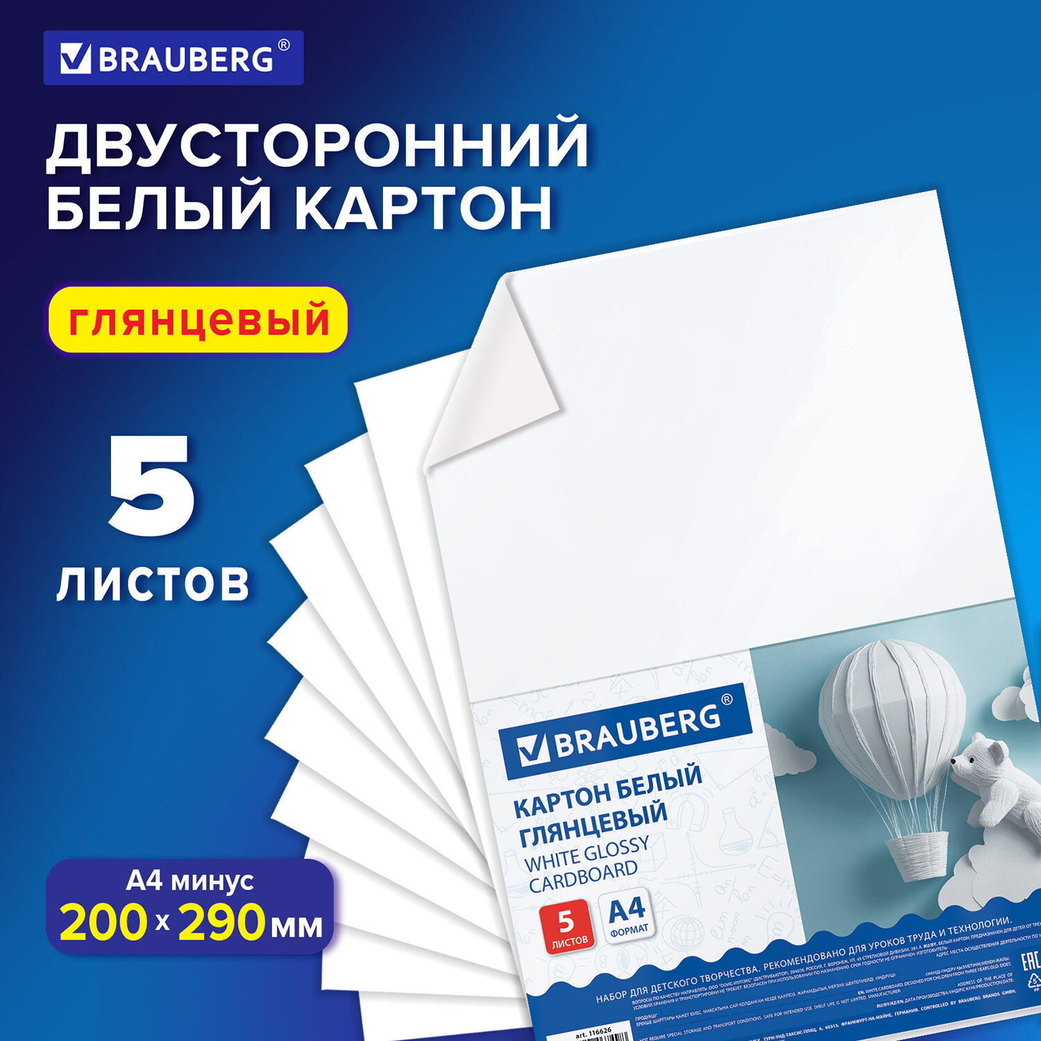 - Картон белый А4 МЕЛОВАННЫЙ (белый оборот) 5 листов, BRAUBERG, 200х290 мм, 116626