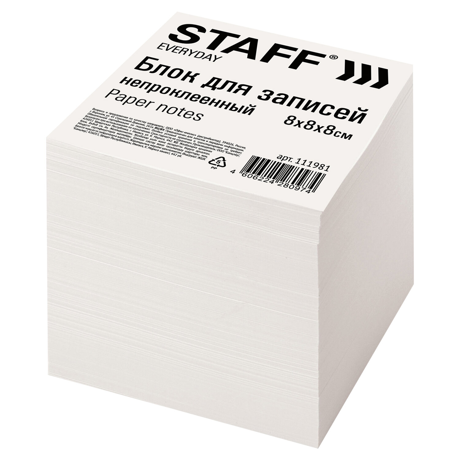 - Блок для записей STAFF непроклеенный, куб 8х8х8 см, белый, белизна 70-80%, 111981