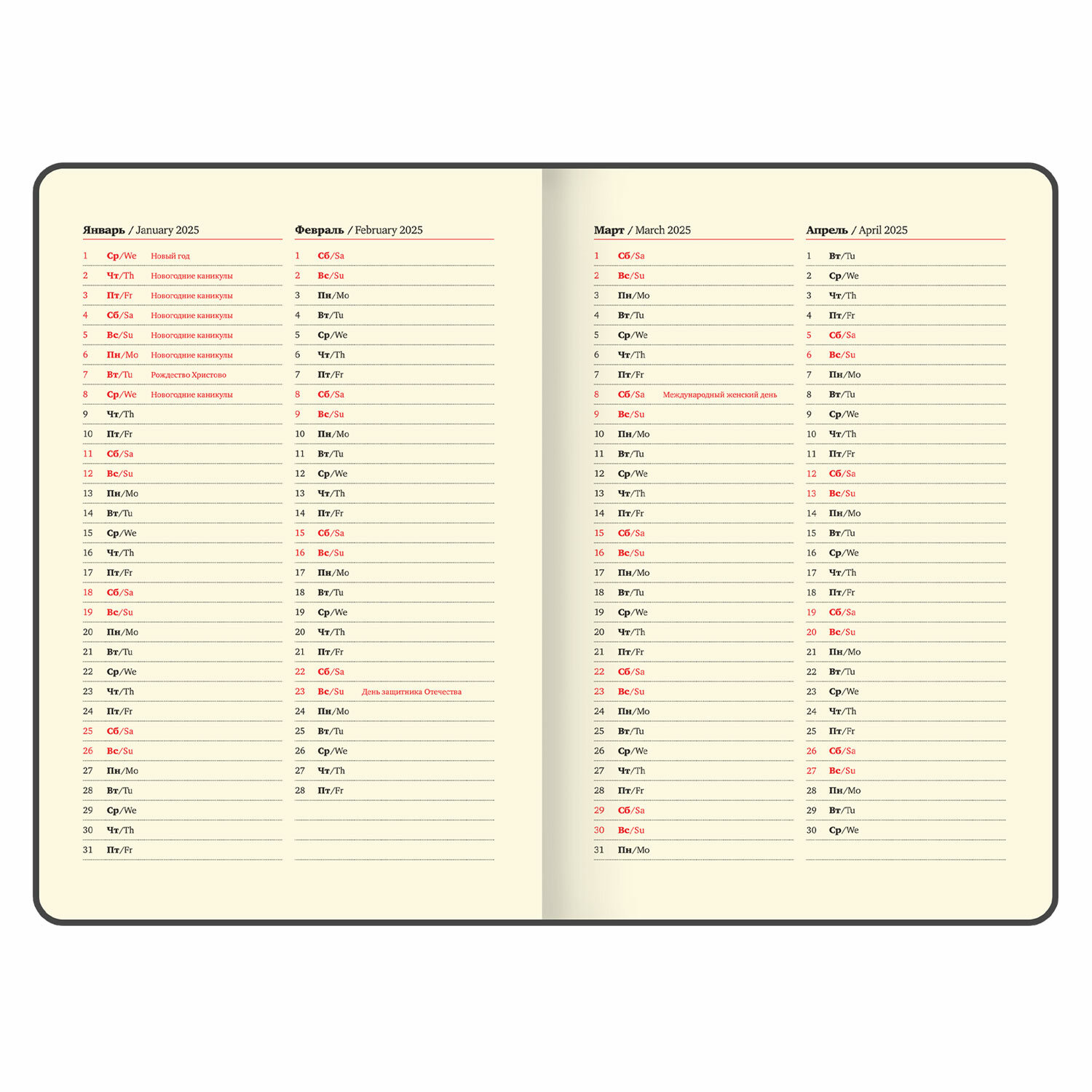 Внутренний блок включает 64 листа тонированной бумаги плотностью 70 г/м2. Благодаря стандартному формату А5 еженедельник удобно использовать как в офисе, так и на выездных деловых встречах. Твердая обложка, стилизованная под кожу с текстурной выработкой, фиксируется магнитной застежкой, поэтому еженедельник не откроется в сумке или портфеле и страницы не помнутся. Подходит для горячего тиснения. Дополнением является закладка-ляссе, с помощью которой при необходимости можно быстро открыть еженедельник на нужной странице. Для заметок в еженедельнике имеется 7 страниц в конце внутреннего блока. Помимо прочего, еженедельник снабжен обширным справочным материалом. Выполнен в классическом темно-синем цвете.