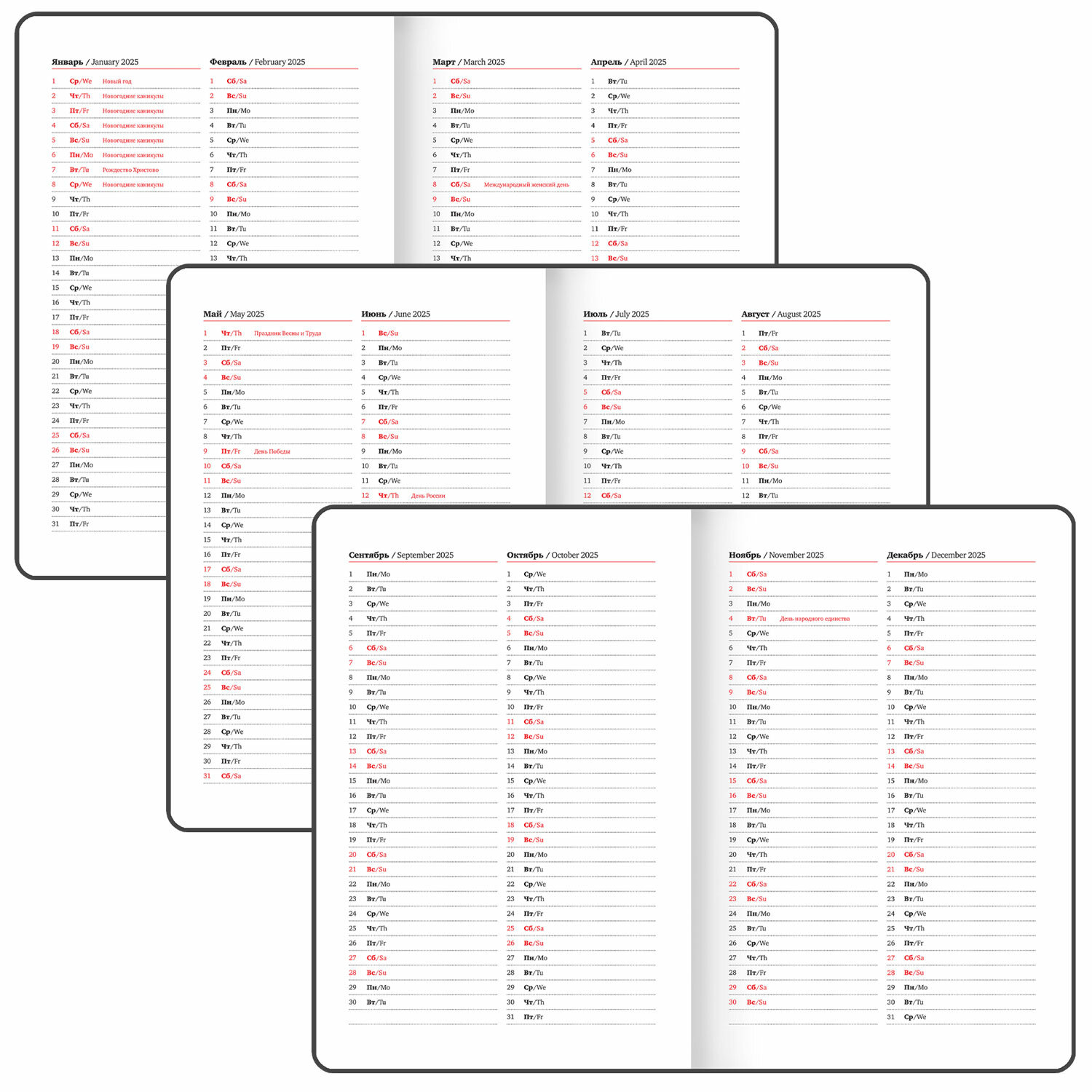 Материал обложки – балакрон, он подходит для тиснения только фольгой. Внутренний блок включает 64 листа белой бумаги плотностью 70 г/м2. Дополнением является закладка-ляссе, с помощью которой при необходимости можно быстро открыть еженедельник на нужной странице. Для заметок в еженедельнике имеется 7 страниц в конце внутреннего блока. Еженедельник снабжен обширным справочным материалом.
