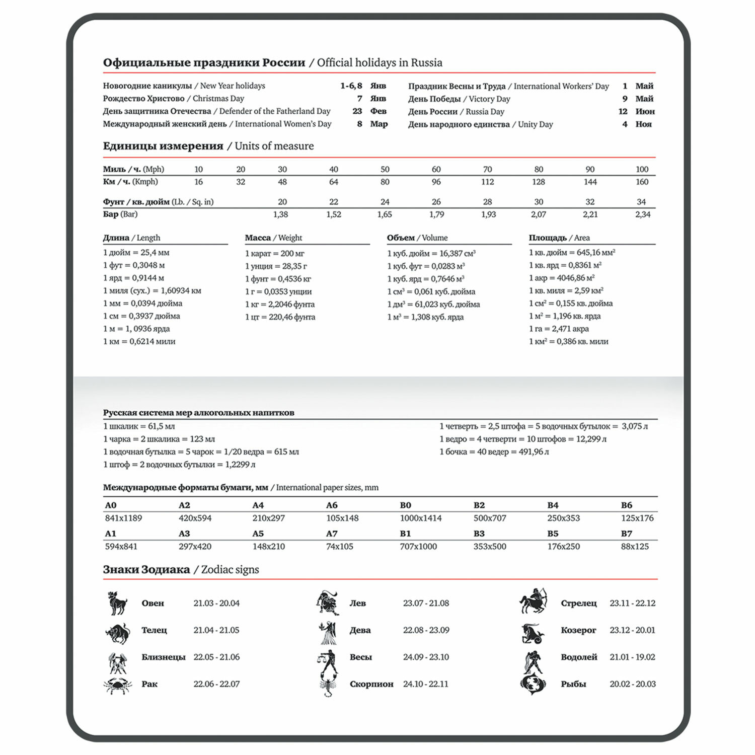 Внутренний блок включает 64 листа белой бумаги плотностью 70 г/м2. Благодаря малому формату А6 еженедельник удобно использовать как в офисе, так и на выездных деловых встречах. Мягкая (интегральная) обложка бирюзового цвета под гладкую кожу имеет декоративное тиснение, что придает ежедневнику особый шарм. Материал обложки подходит для горячего тиснения. Дополнением является закладка-ляссе, с помощью которой при необходимости можно быстро открыть еженедельник на нужной странице. Для заметок в еженедельнике имеется 7 страниц в конце внутреннего блока. Помимо прочего, еженедельник снабжен обширным справочным материалом.