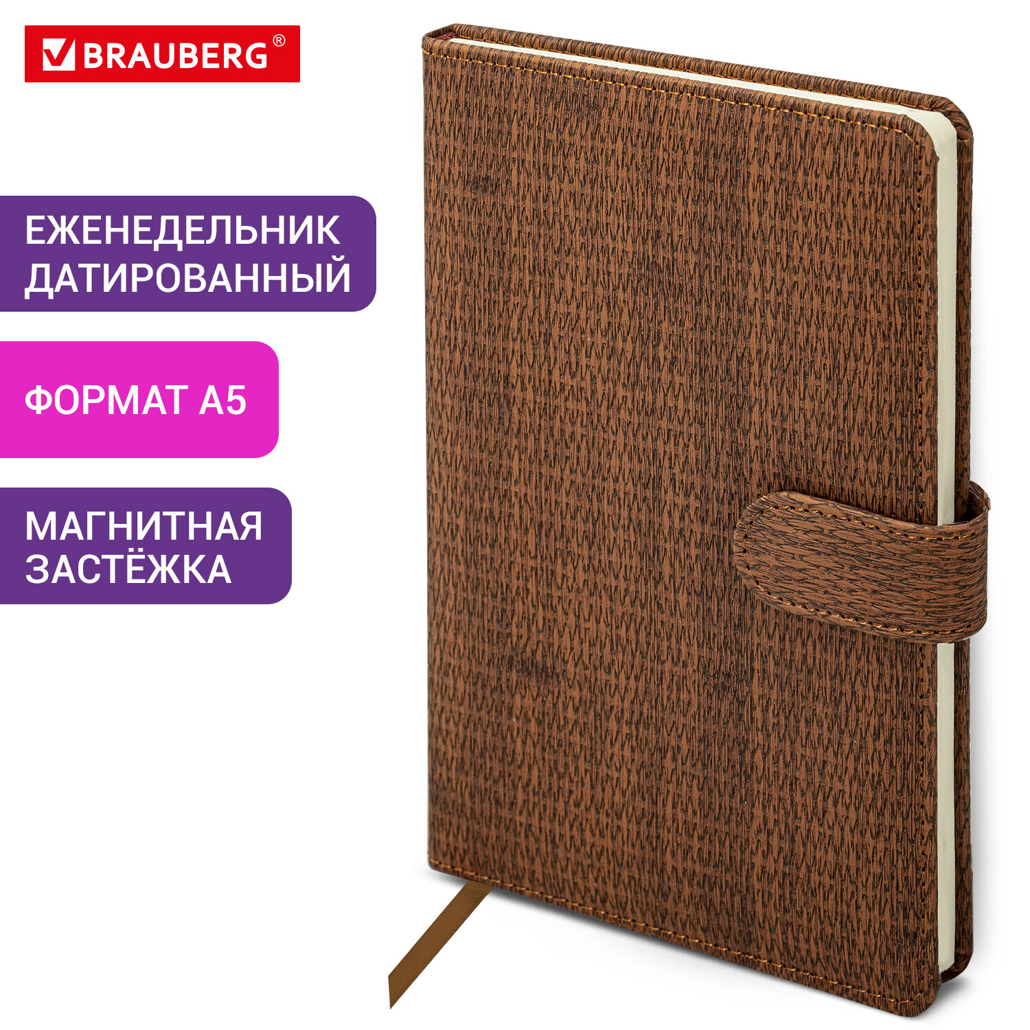 - Еженедельник датированный 2026 А5 145х215 мм, BRAUBERG "Augustus", под кожу, коричневый, 117162