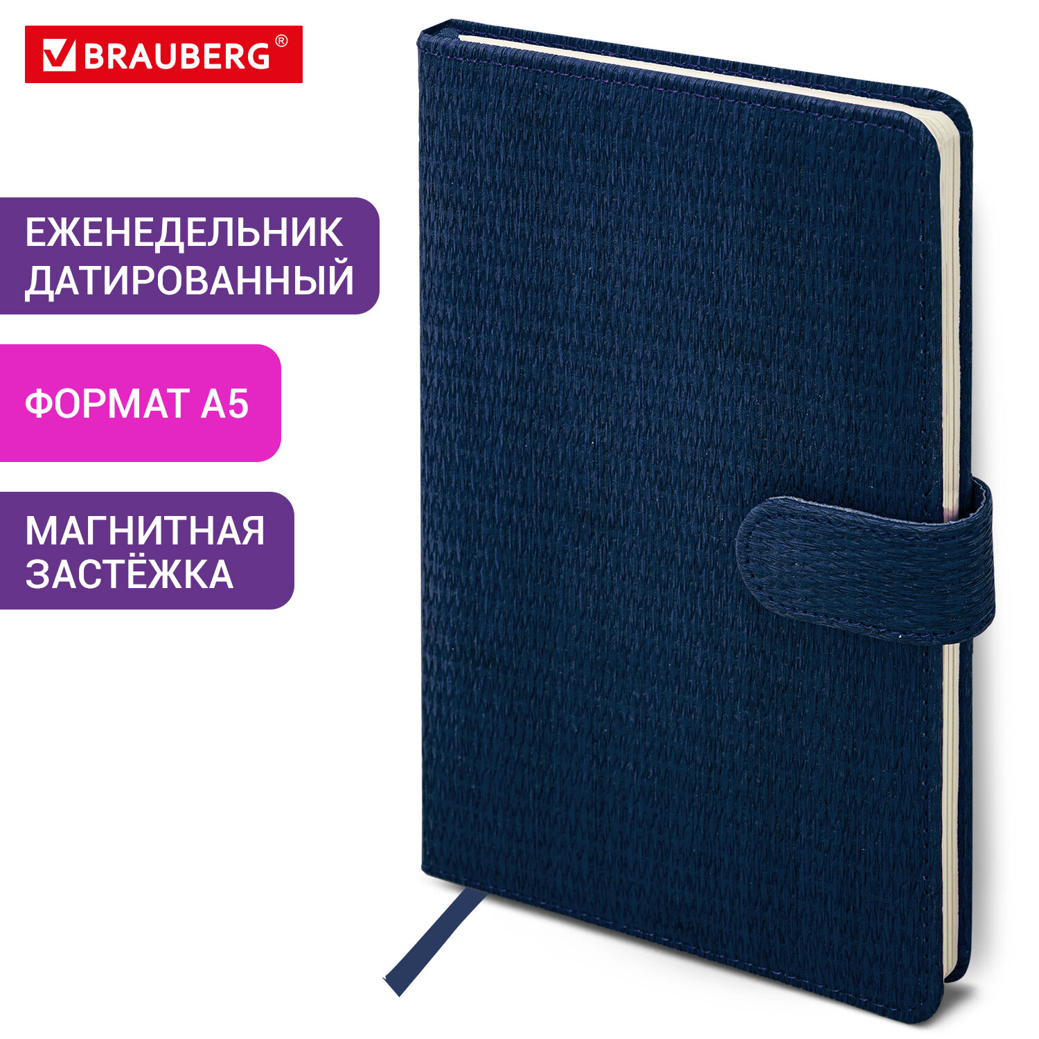 Внутренний блок включает 64 листа тонированной бумаги плотностью 70 г/м2. Благодаря стандартному формату А5 (145х215 мм) еженедельник удобно использовать как в офисе, так и на выездных деловых встречах. Твердая обложка, стилизованная под кожу с текстурной выработкой, фиксируется магнитной застежкой, поэтому еженедельник не откроется в сумке или портфеле и страницы не помнутся. Подходит для горячего тиснения. Еженедельник выполнен в темно-синем цвете.