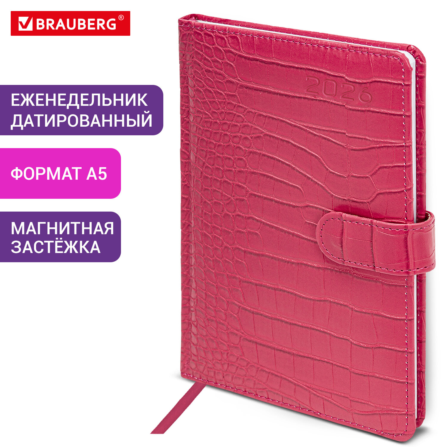 Датированный еженедельник BRAUBERG t;Partyt; – настоящая классика, проверенная временем. Идеально подойдет для офисных работников и людей, занимающихся бизнесом. Еженедельник датированный 2026 А5 145х215 мм, BRAUBERG "Party", под кожу, розовый, 117176
