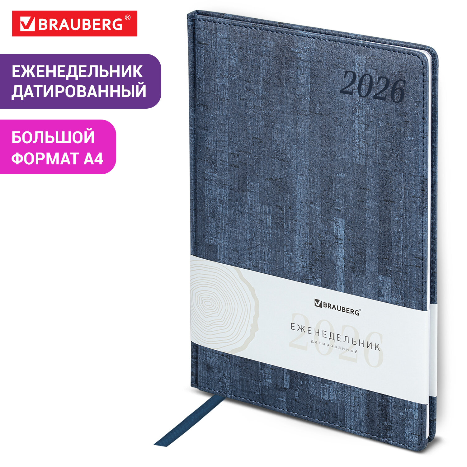 - Еженедельник датированный 2026 БОЛЬШОЙ ФОРМАТ 210х297 мм, А4 BRAUBERG "Wood", под кожу, синий, 117158