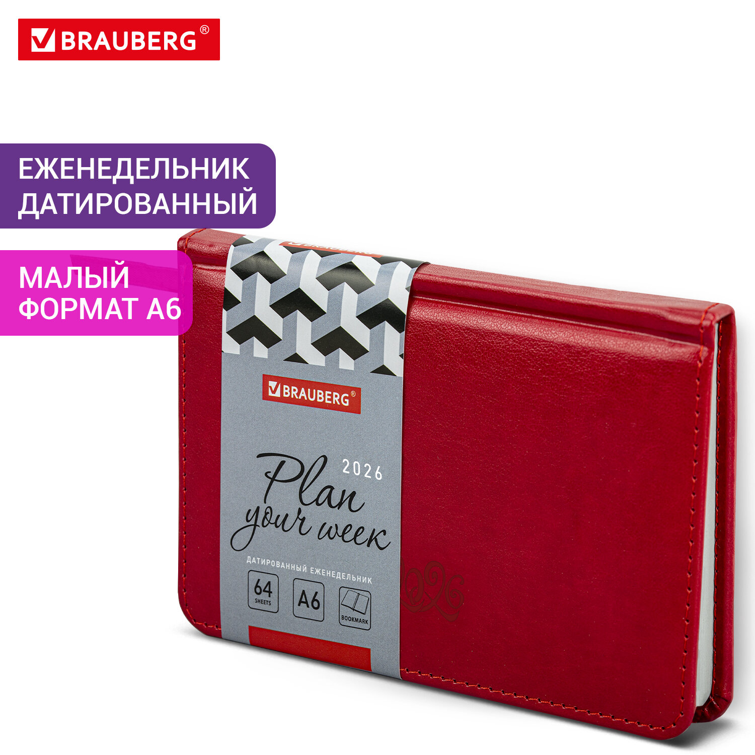 - Еженедельник датированный 2026, МАЛЫЙ ФОРМАТ 95х155 мм, А6, BRAUBERG "Rainbow", под кожу, красный, 117190