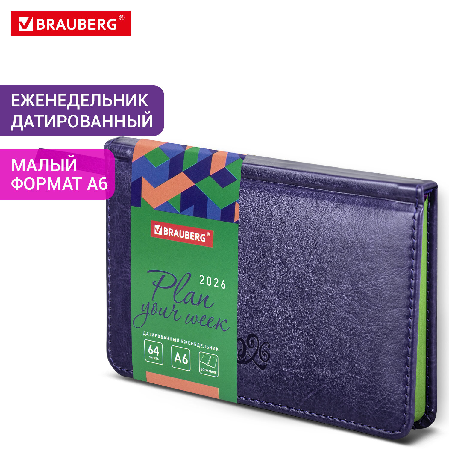 - Еженедельник датированный 2026, МАЛЫЙ ФОРМАТ 95х155 мм, А6, BRAUBERG "Rainbow", под кожу, сиреневый, 117191