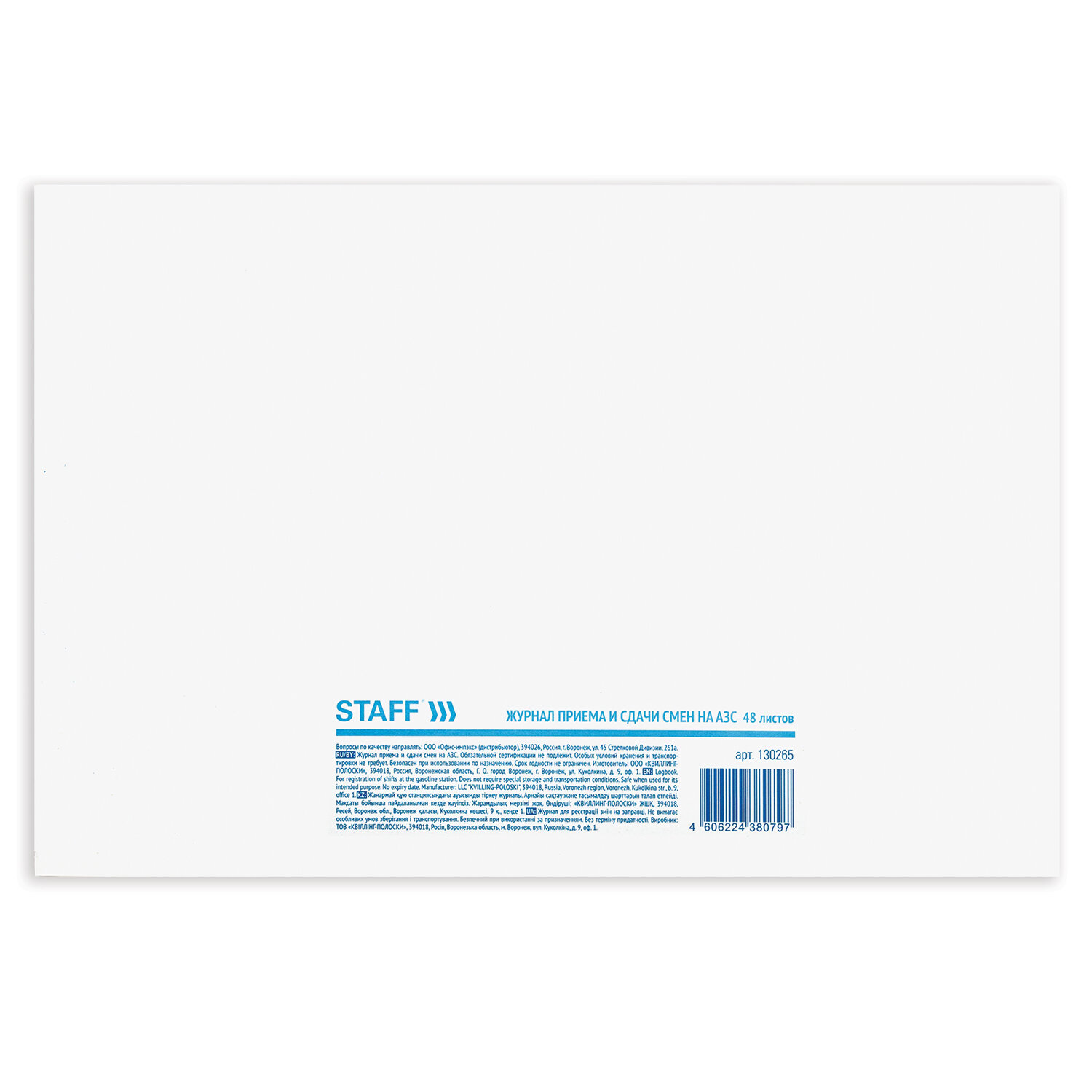 Обложка выполнена из высококачественного мелованного картона плотностью 240 г/м2. Горизонтальная ориентация. Внутренний блок содержит 48 листов офсетной белой бумаги плотностью 65 г/м2. Формат - А4 (292x200 мм). Журнал приема и сдачи смен на АЗС, 48 л., картон, блок офсет, А4 292х200 мм, STAFF, 130265