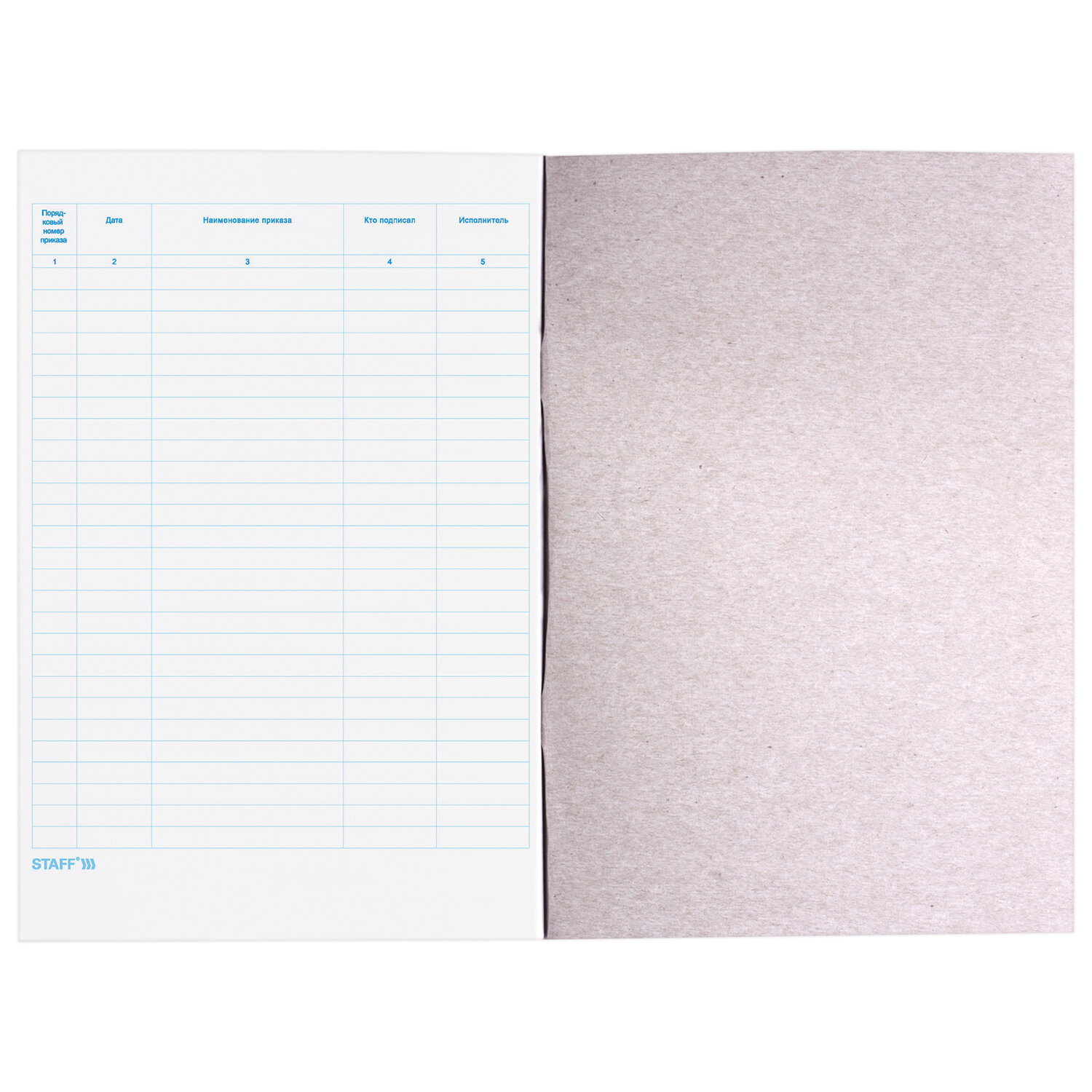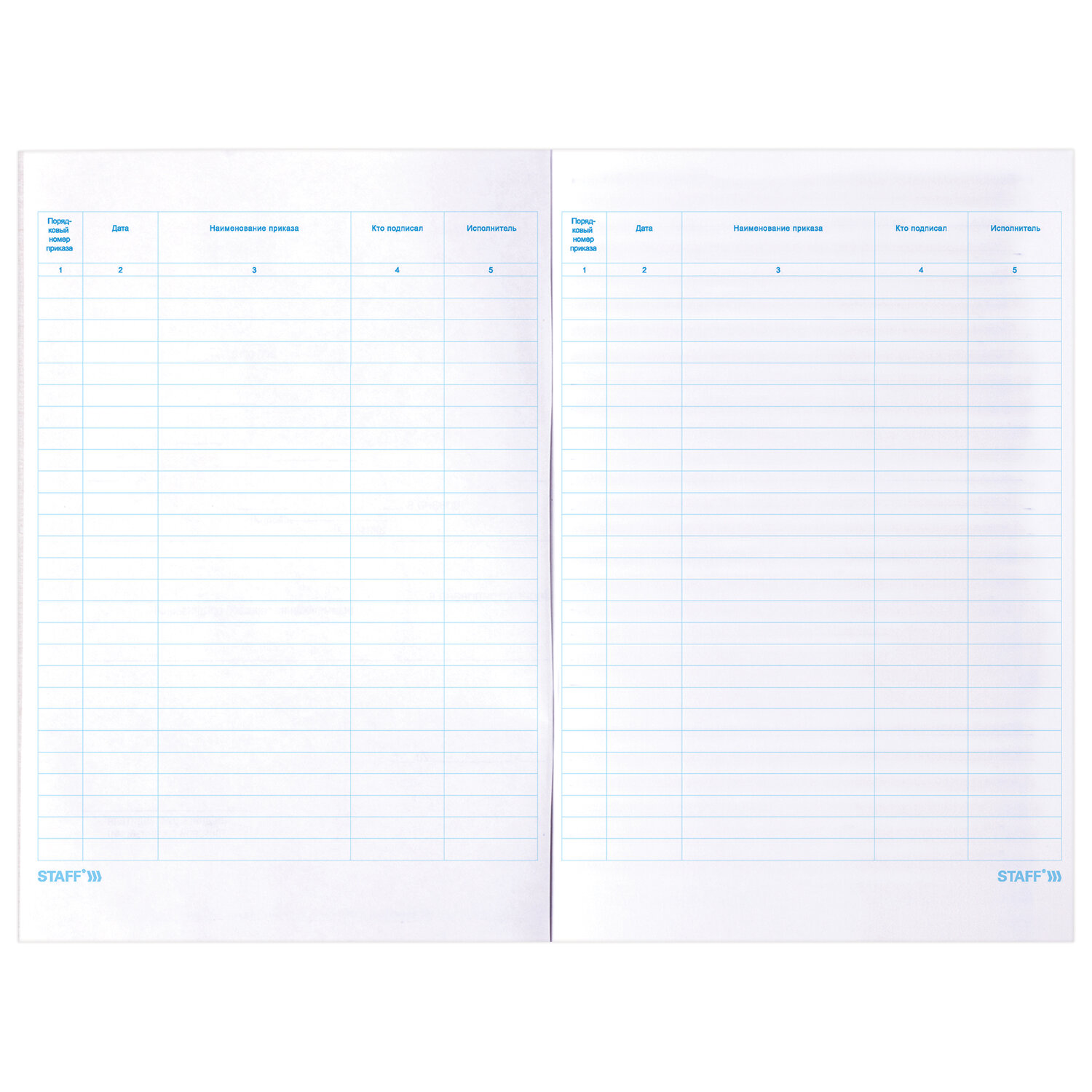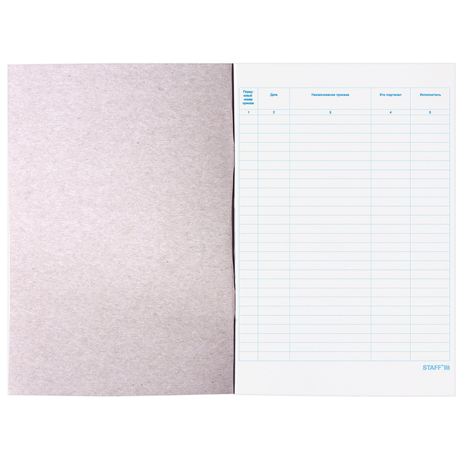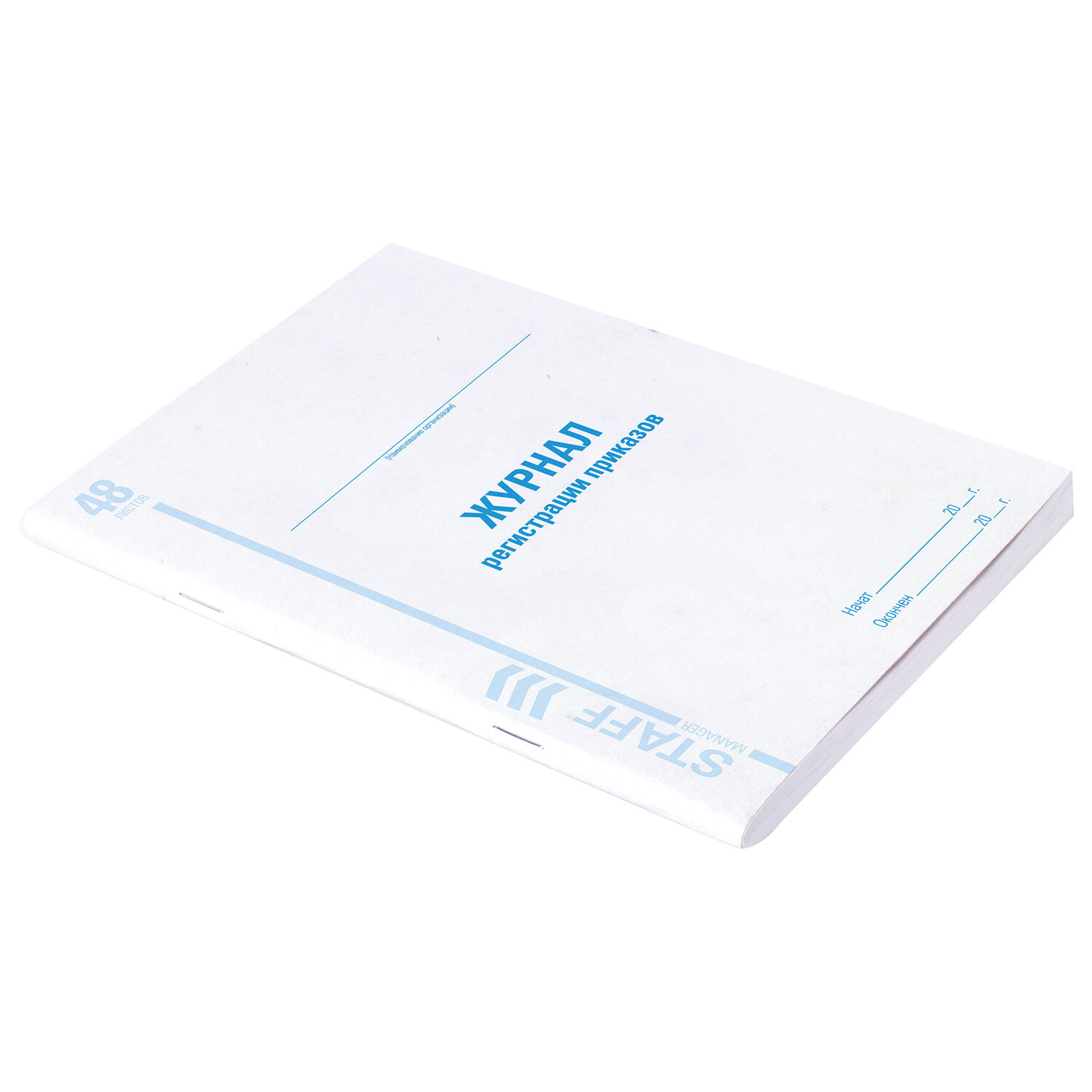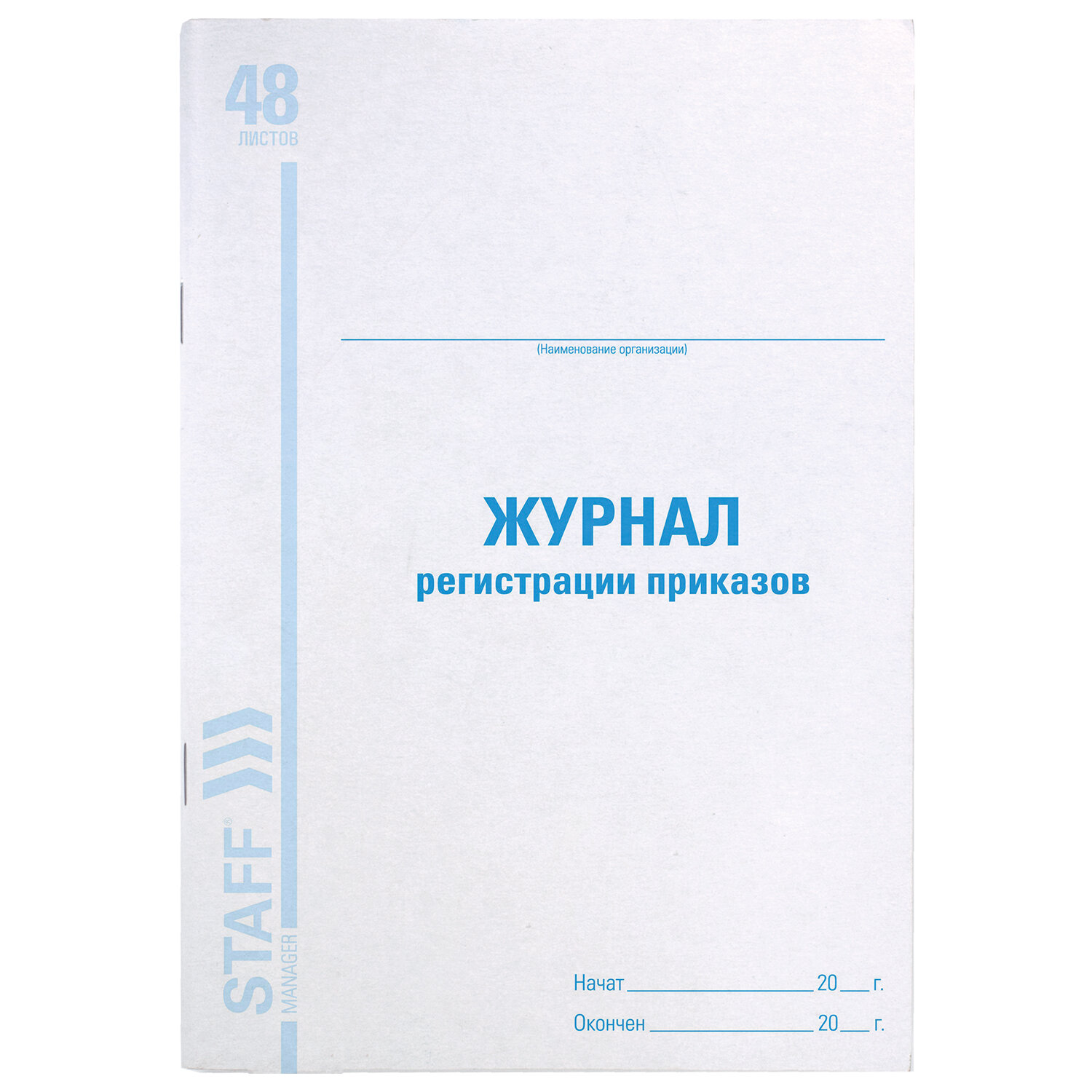 Имеет мягкую картонную обложку плотностью 200 г/м2. Название на обложке выполнено печатью офсетного способа. Вертикальная ориентация. Внутренний блок содержит 48 листов офсетной бумаги плотностью 60 г/м2, разлиновкой и текстом, облегчающими ведение записей. Формат - А4 (200х290 мм). Журнал регистрации приказов, 48 л., картон, блок офсет, А4 200х290 мм, STAFF, 130079