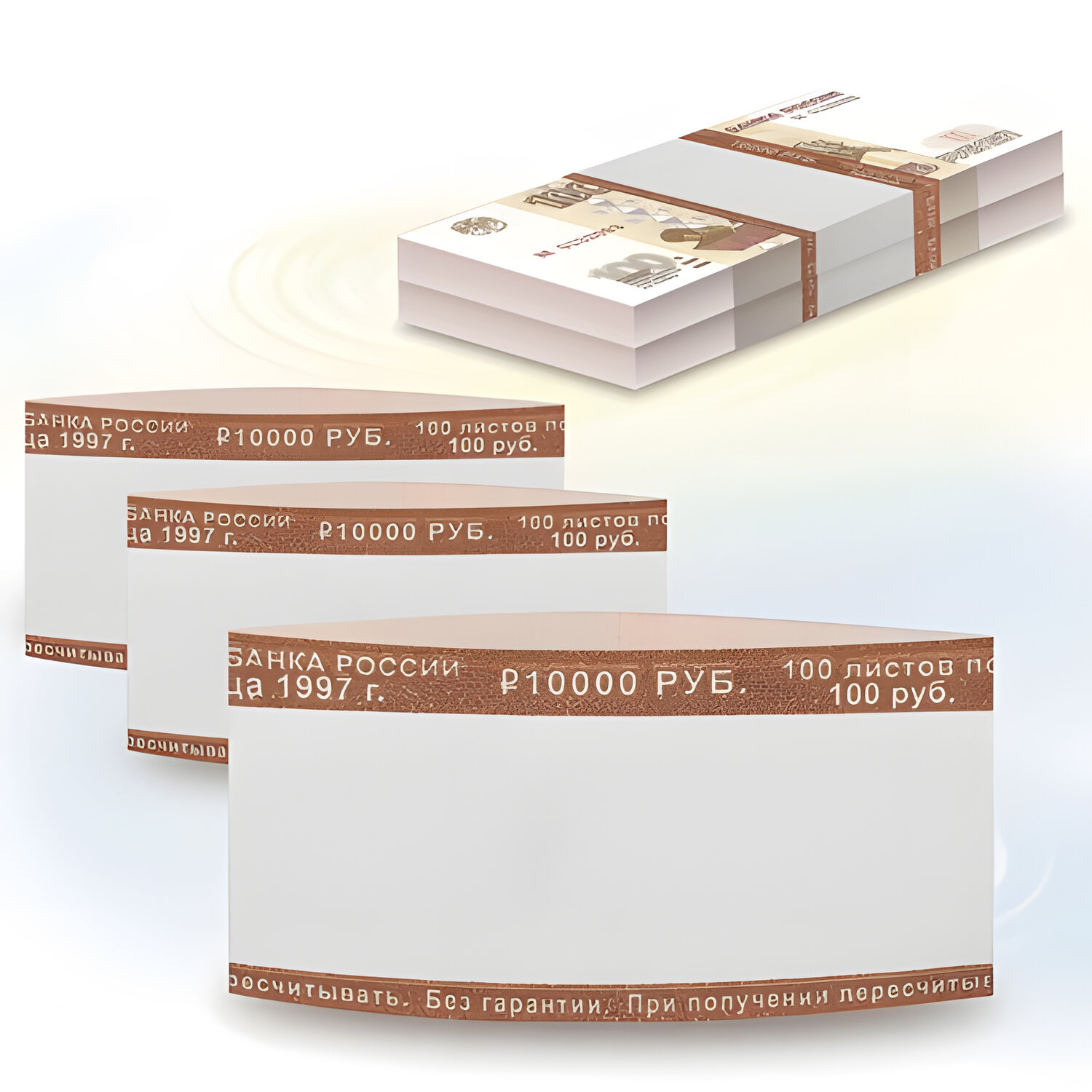 Банковская упаковка, исполненная в виде склеенной кольцевой поперечной бандероли с нанесением количества банкнот и номинала, а так же другой обязательной информации. Позволяет кассиру быстро, просто и надежно сформировать корешок банкнот (100 листов). Бандероли кольцевые, комплект 500 шт., номинал 100 руб., 600519