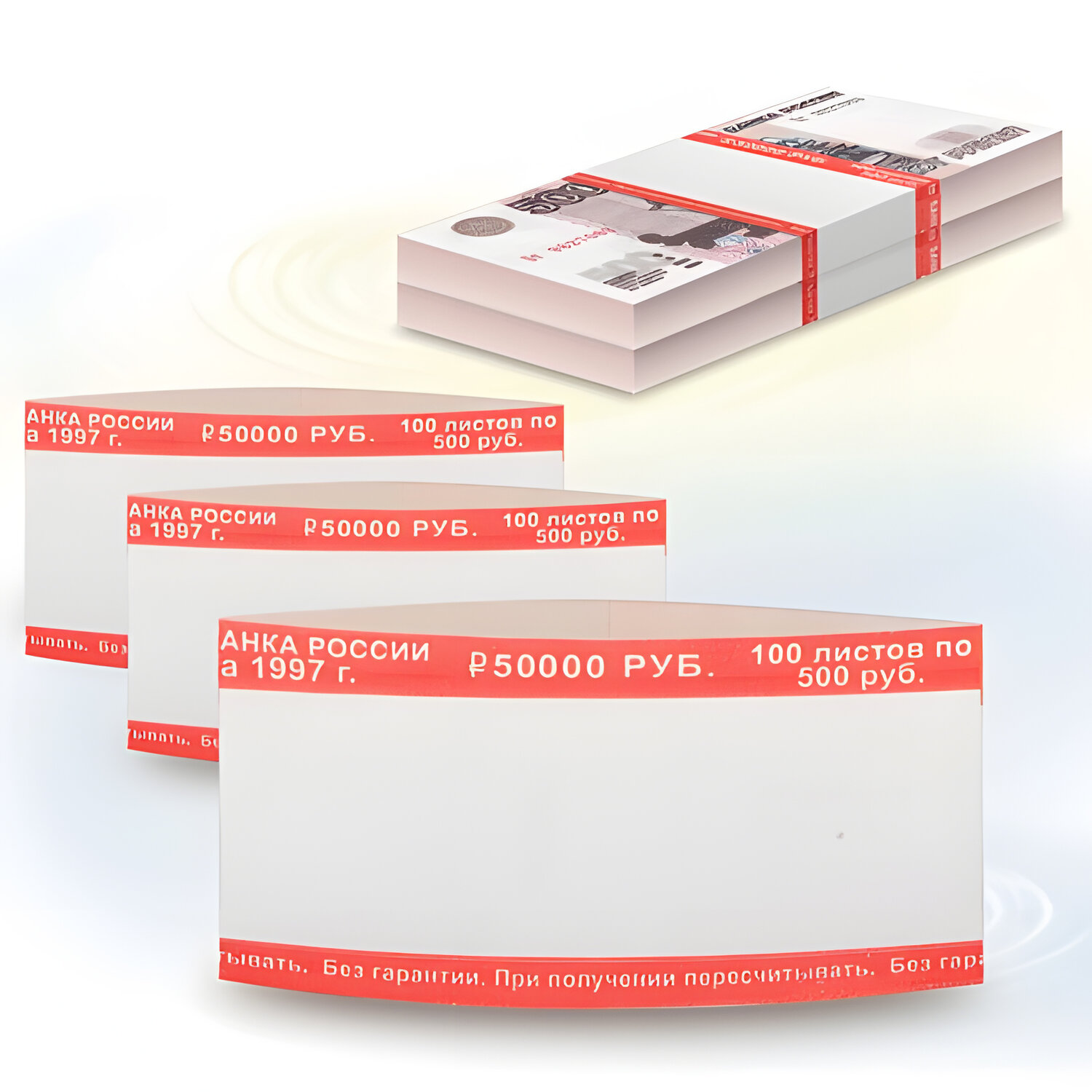Банковская упаковка, исполненная в виде склеенной кольцевой поперечной бандероли с нанесением количества банкнот и номинала, а так же другой обязательной информации. Позволяет кассиру быстро, просто и надежно сформировать корешок банкнот (100 листов). Бандероли кольцевые, комплект 500 шт., номинал 500 руб., 600536