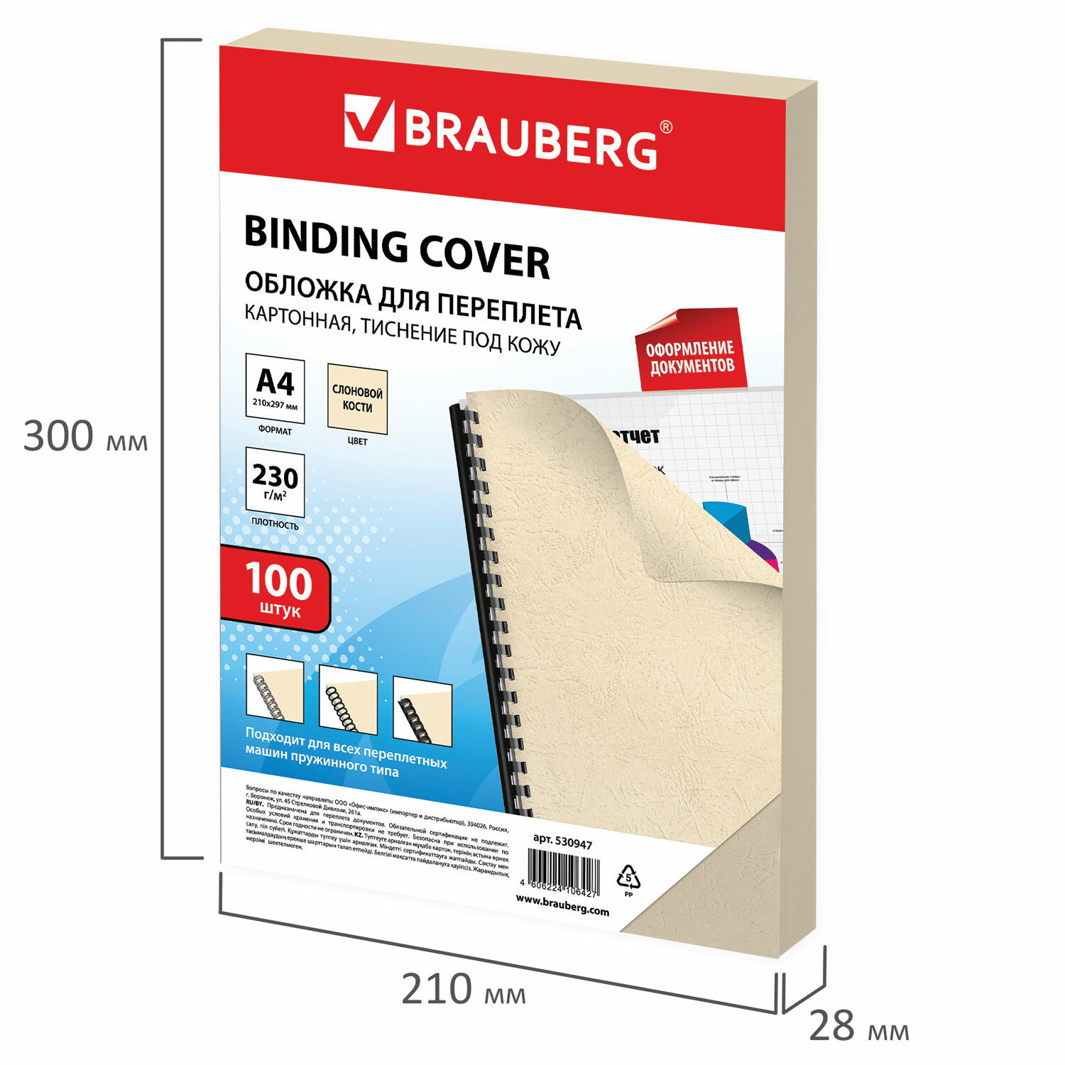 - Обложки картонные для переплета, А4, КОМПЛЕКТ 100 шт., тиснение под кожу, 230 г/м2, слоновая кость, BRAUBERG, 530947