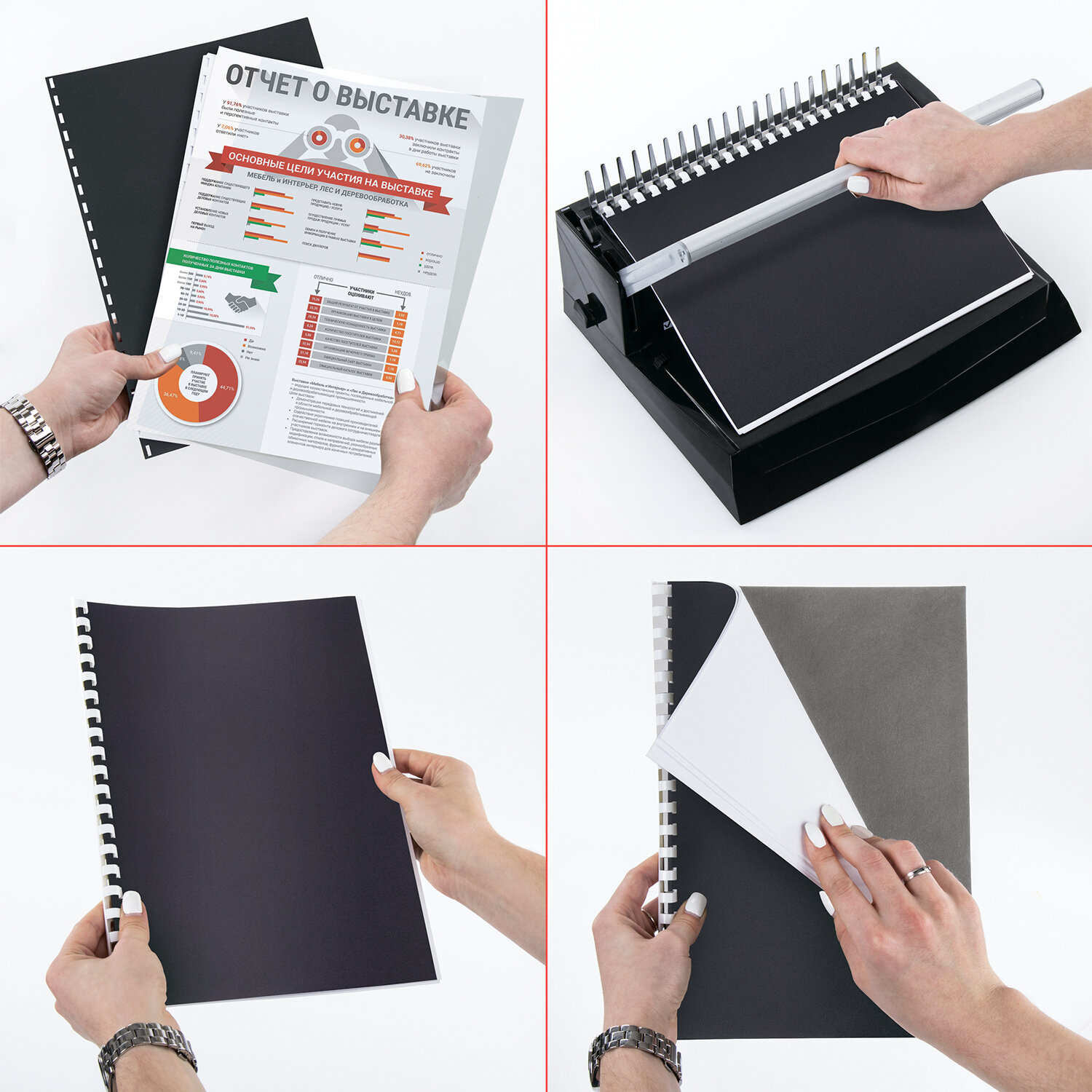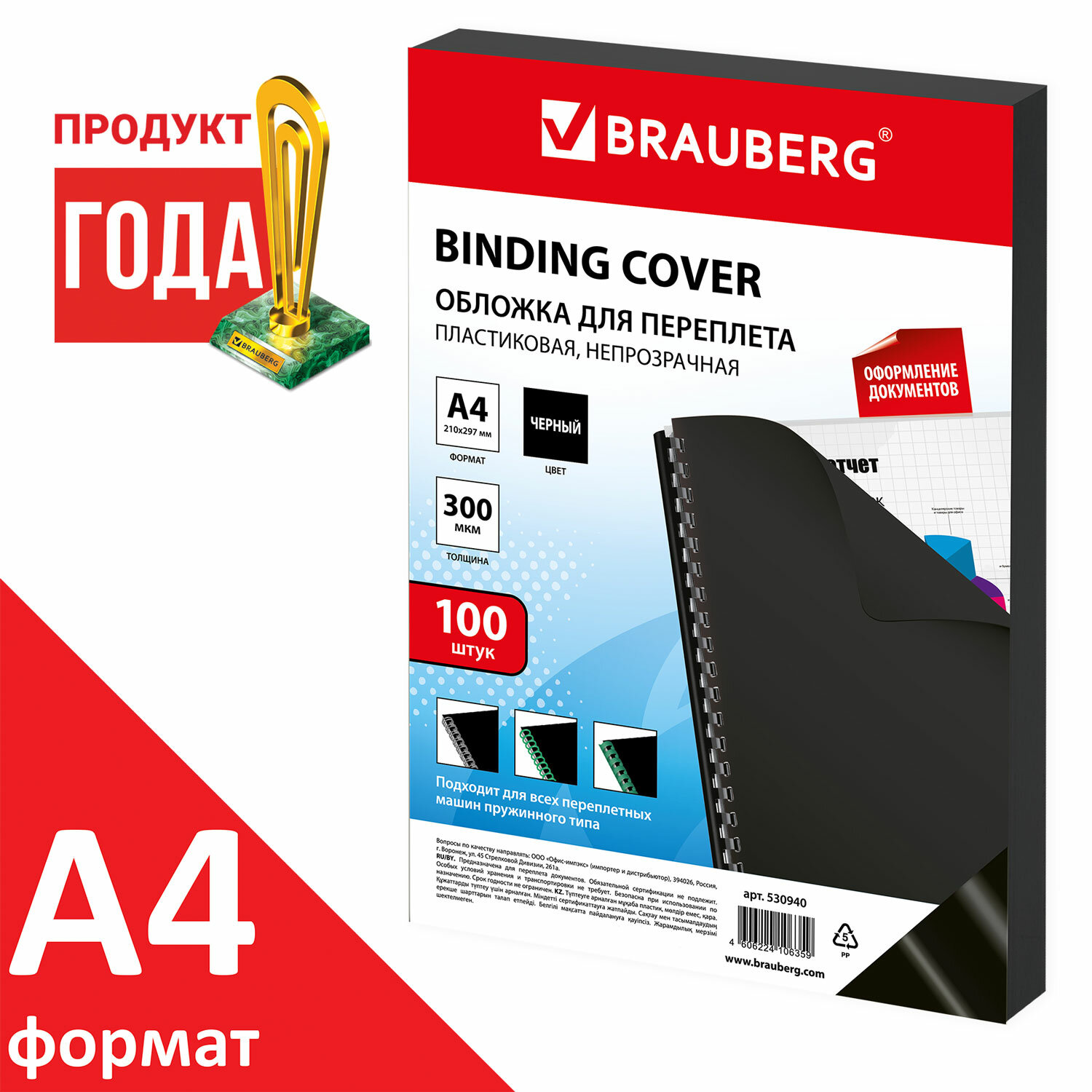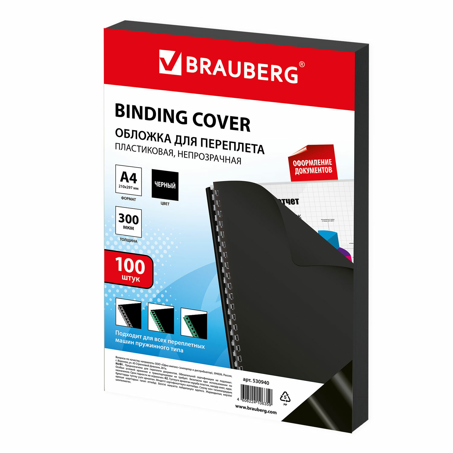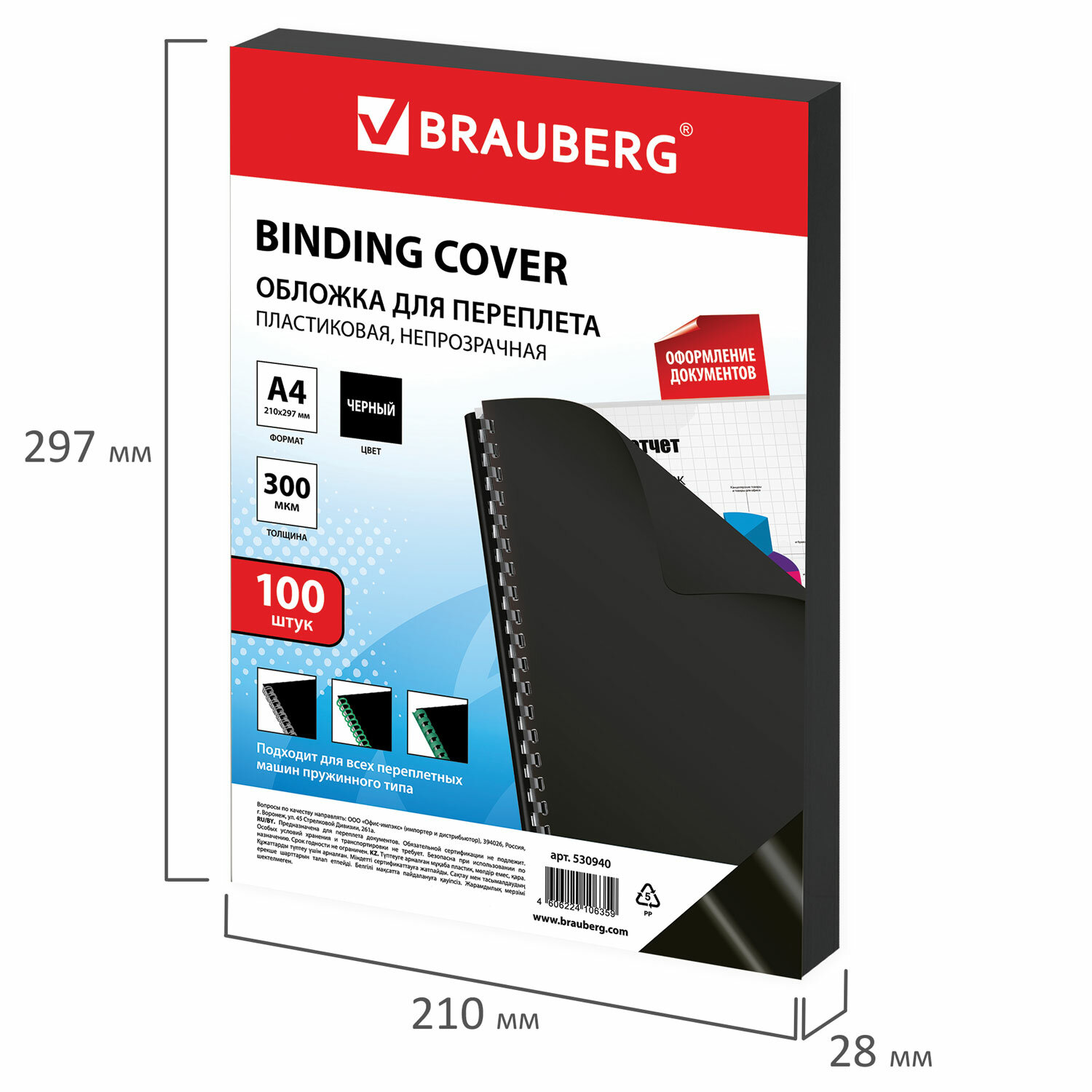 - Обложки пластиковые для переплета, А4, КОМПЛЕКТ 100 шт., 300 мкм, черные, BRAUBERG, 530940