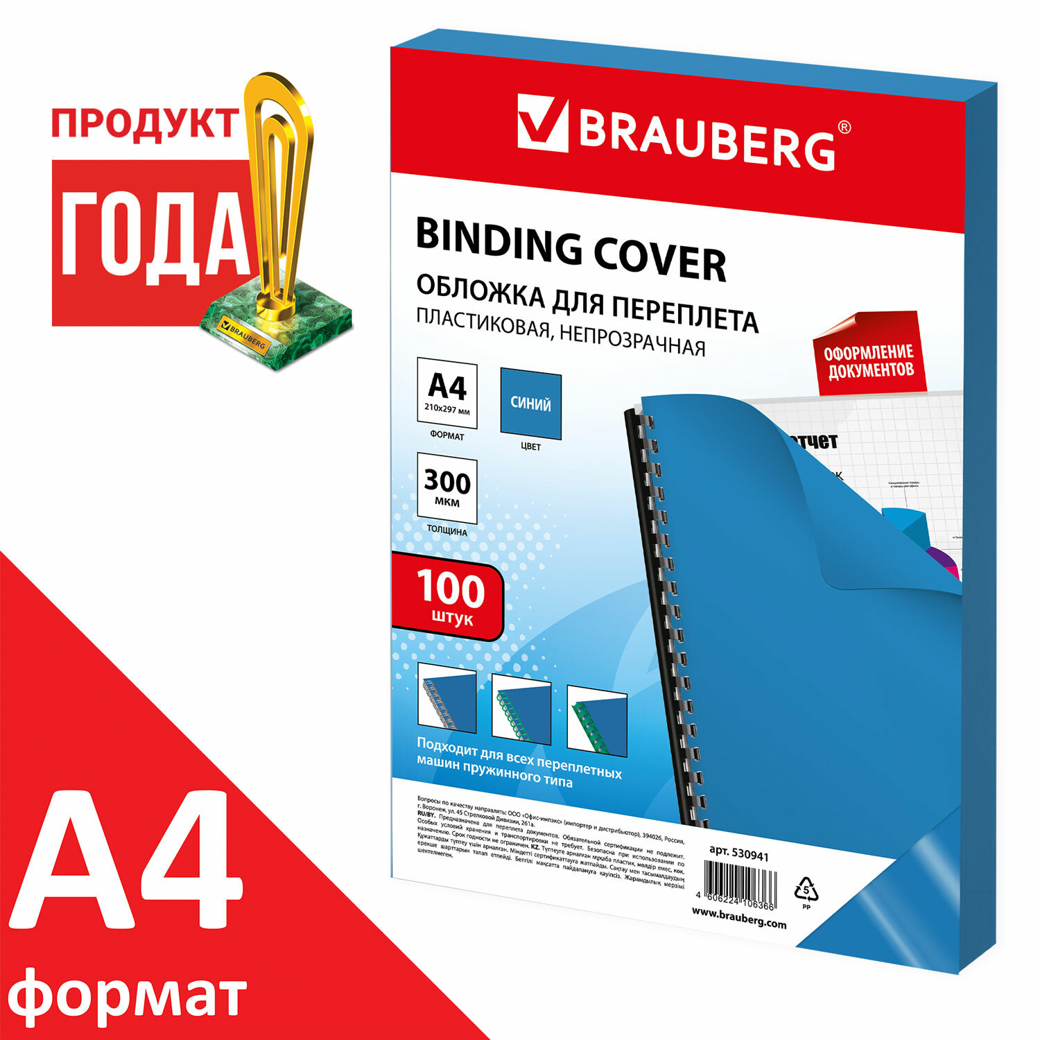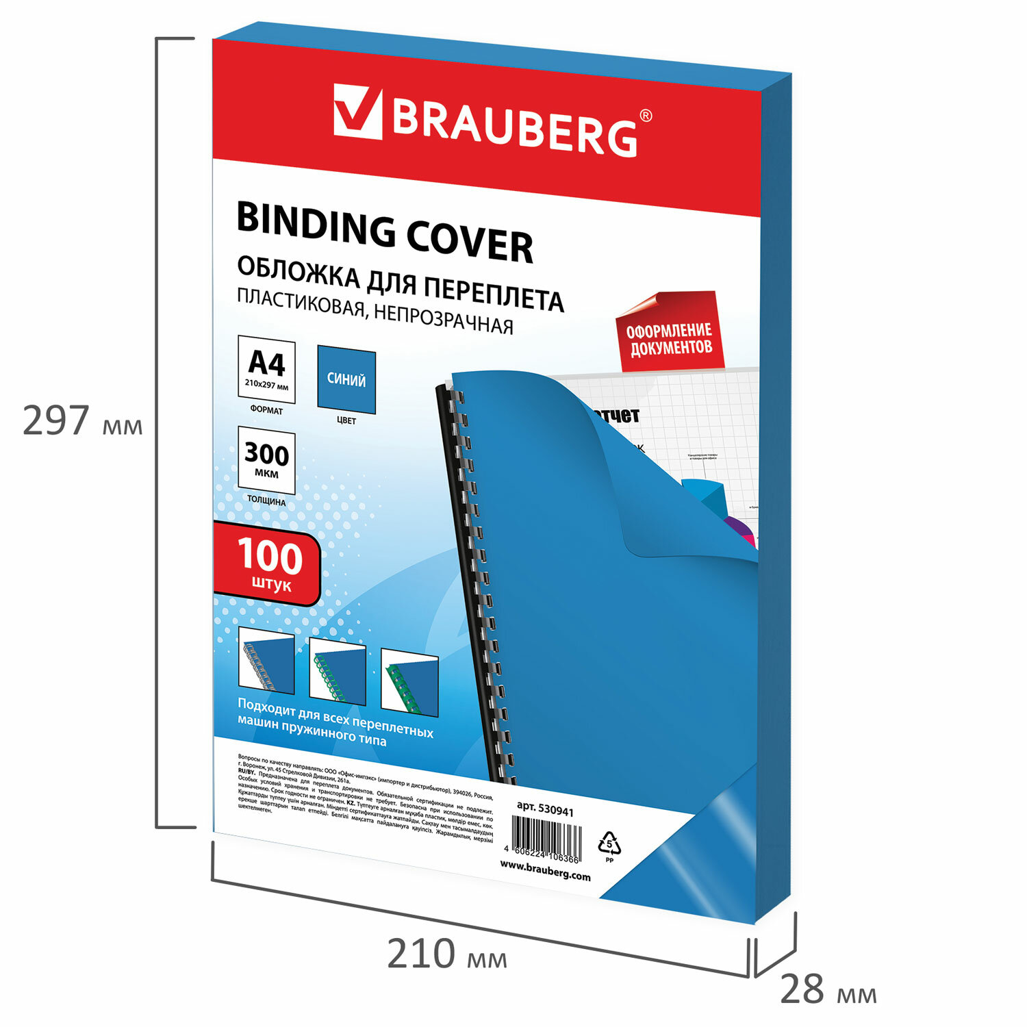 - Обложки пластиковые для переплета, А4, КОМПЛЕКТ 100 шт., 300 мкм, синие, BRAUBERG, 530941
