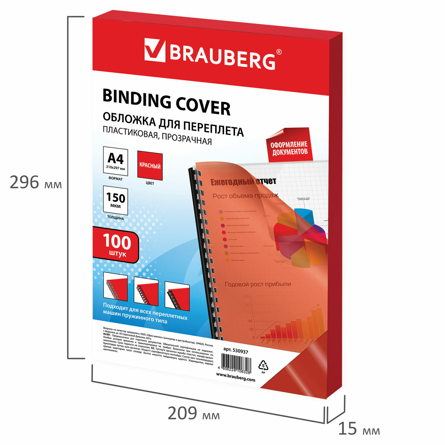 - Обложки пластиковые для переплета А4, КОМПЛЕКТ 100 штук, 150 мкм, прозрачно-красные, BRAUBERG, 530937