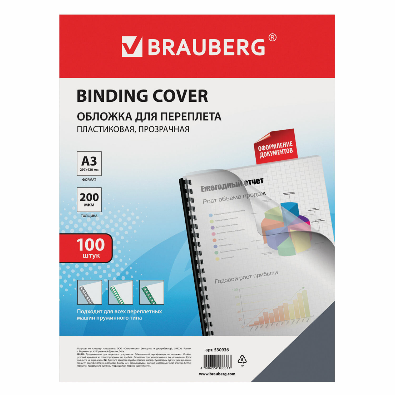 - Обложки пластиковые для переплета БОЛЬШОЙ ФОРМАТ А3, КОМПЛЕКТ 100 шт., 200 мкм, прозрачные, BRAUBERG, 530936