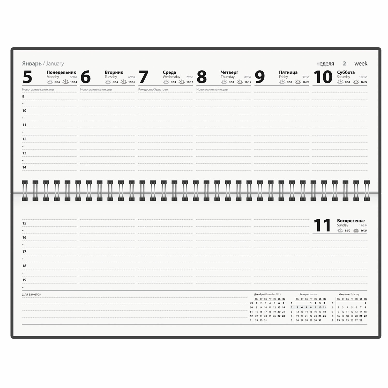 Внутренний блок содержит 64 листа офсетной бумаги белого цвета плотностью 65 г/м2. Обложка из мелованного картона обеспечивает долгий срок службы. Скрепление выполнено с помощью евроспирали. Размер изделия – 285х112 мм. Планинг датированный 2026 285х112 мм, STAFF, гребень, картонная обложка, 64 л., "Black style", 117363
