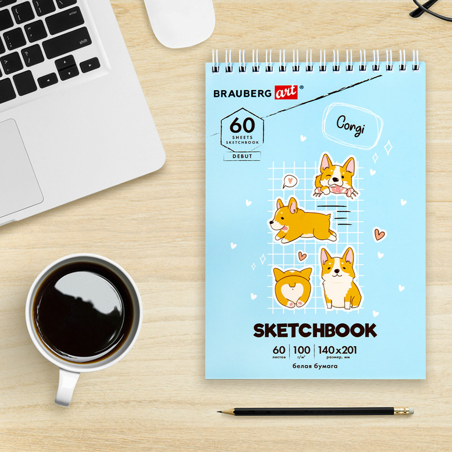 - Скетчбук, белая бумага 100 г/м2, 140х201 мм, 60 л., гребень, жёсткая подложка, BRAUBERG ART DEBUT, "Корги", 115064