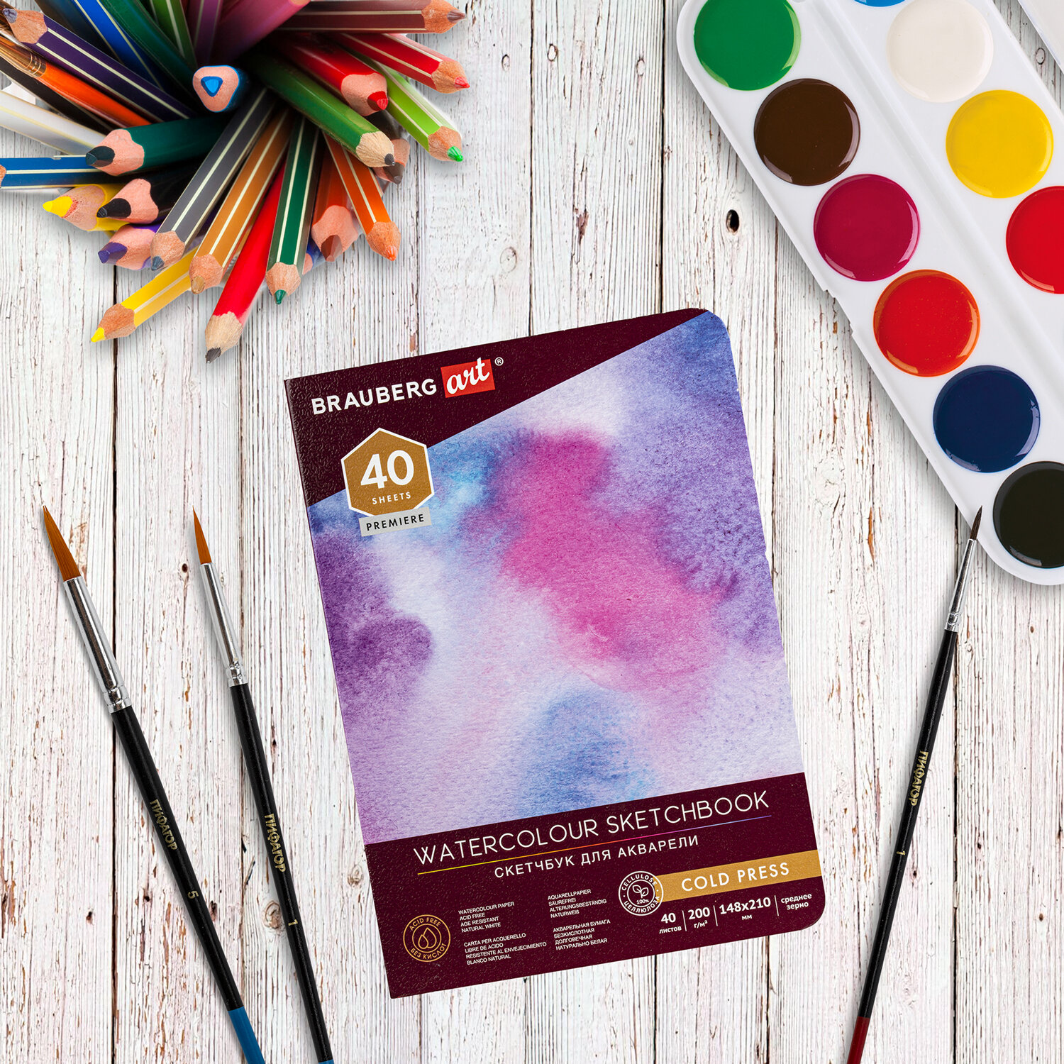 - Скетчбук для акварели, 200 г/м2, 148х210 мм, среднее зерно, 40 л., книжный переплет, BRAUBERG ART PREMIERE, 113262