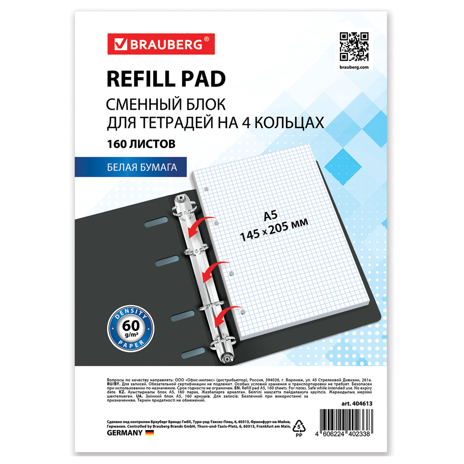 - Сменный блок для тетради на кольцах А5, 160 л., BRAUBERG, "Белый", 404613