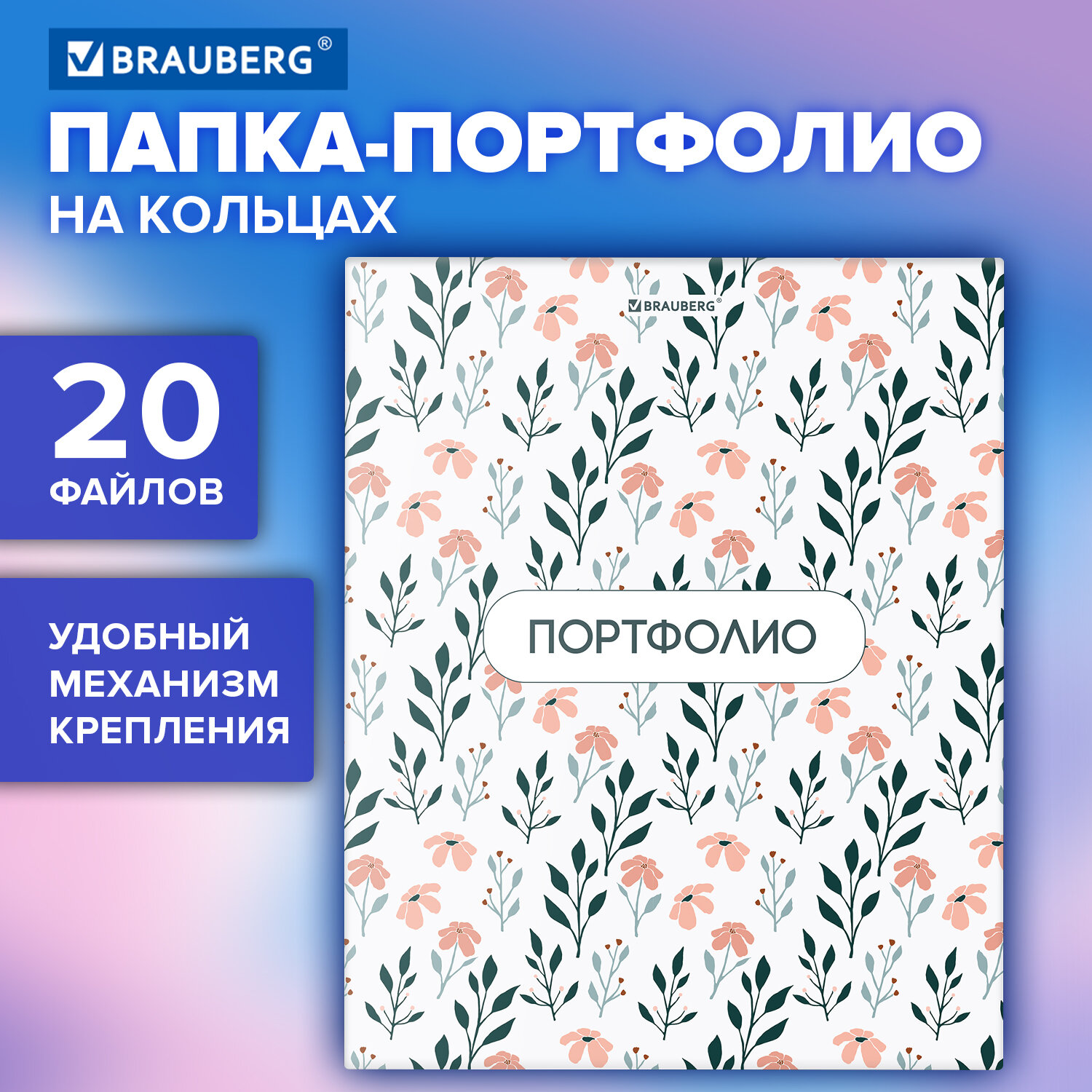 - Папка-портфолио универсальная, 4 кольца, 20 файлов, 7БЦ матовая, BRAUBERG "Flowers", 117556