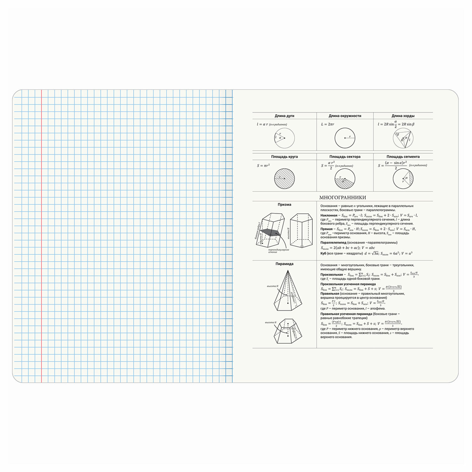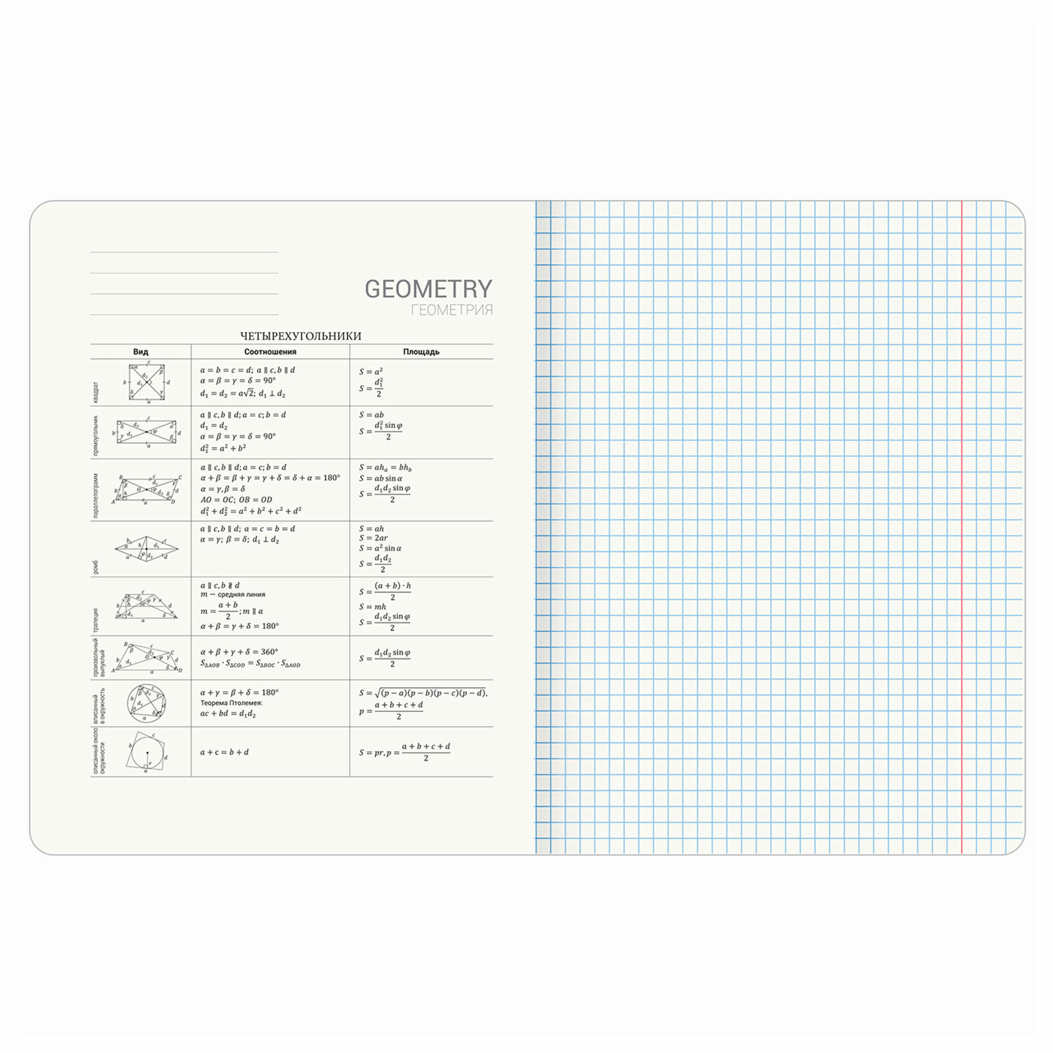 Тетрадь по геометрии формата А5 (165х202 мм) содержит 48 листов, изготовленных из высококачественной офсетной бумаги 100% белизны, плотностью 60 г/м2. Листы соединены скобами. Линовка блока - в клетку, красные поля.